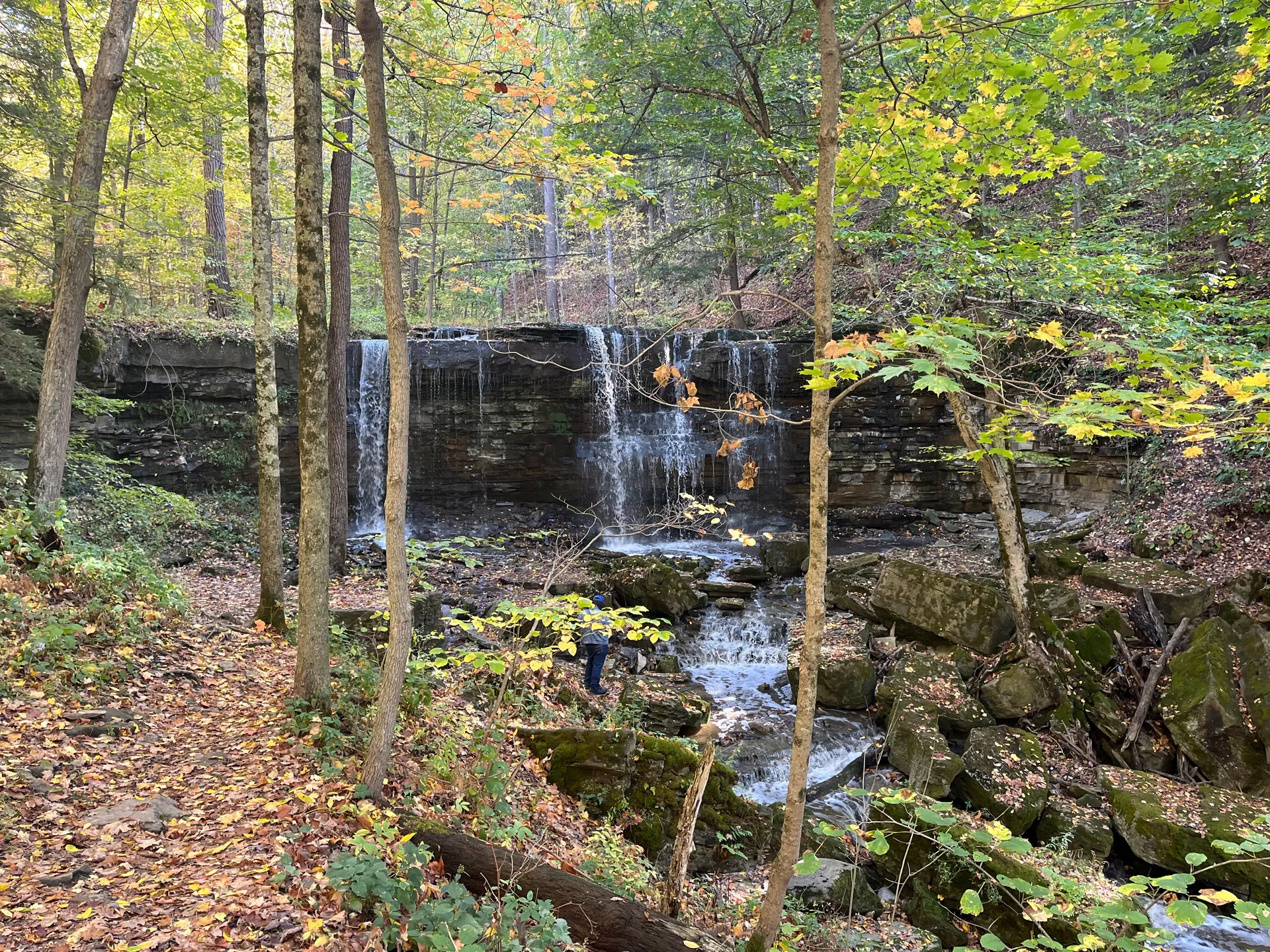 Es ist Herbst: Die Blätter an den Bäumen sind bunt, und die Wege sind eine Mischung aus Forst- und Wanderwegen mit einigen Abschnitten von Single-Trails. Auch wenn der Wasserfall nicht besonders spektakulär ist, hat man unterwegs doch tolle Ausblicke.