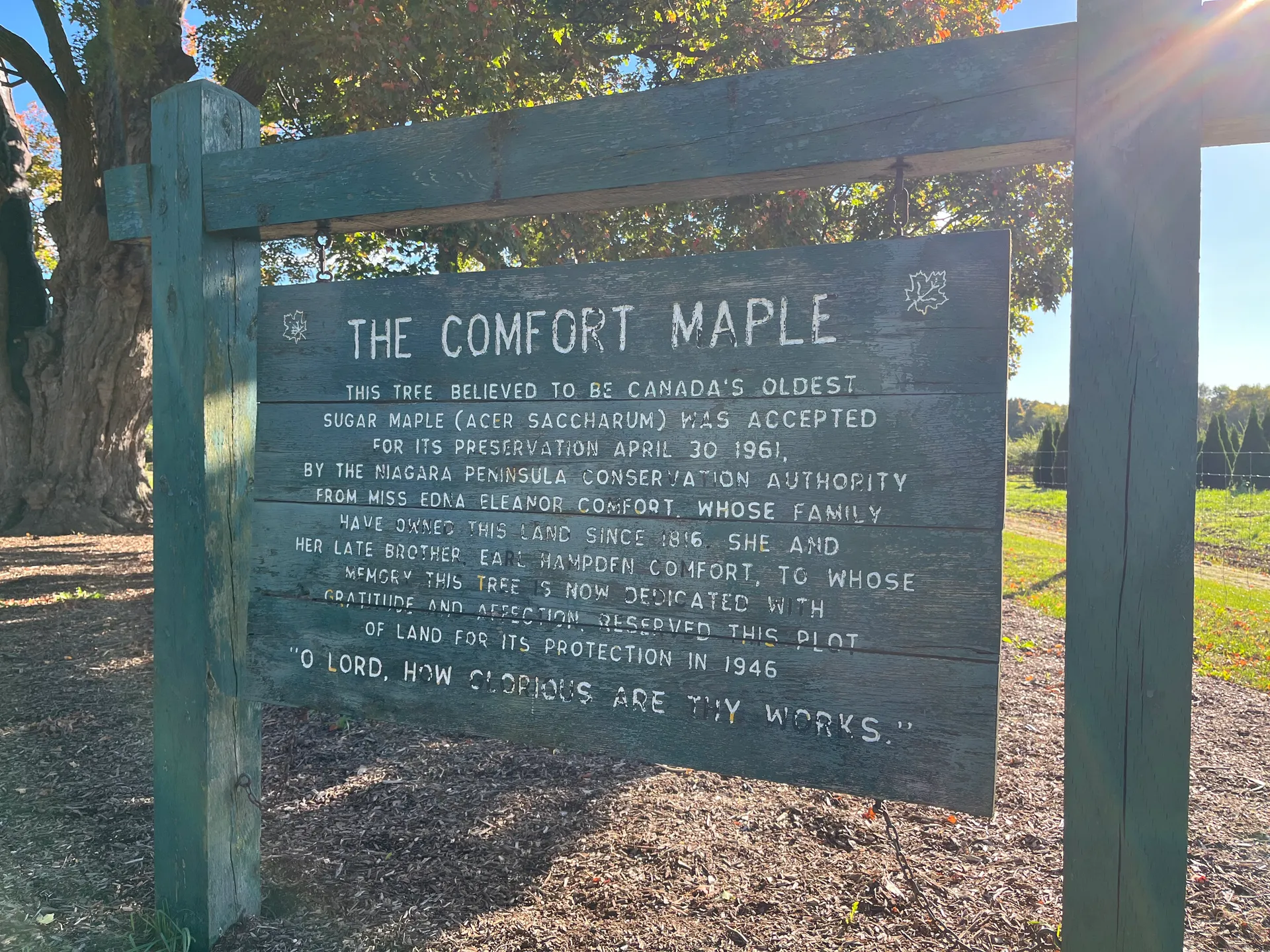 Wenn man schon hier ist, sollte man auch einen der ältesten Ahornbäume der Welt besuchen: die Comfort Maple in Pelham, Ontario, geschätzt auf 500 Jahre. Der Baum ist nicht leicht zu finden, aber über „Comfort Maple Conservation Area“ gibt das Navi die richtige Route vor.