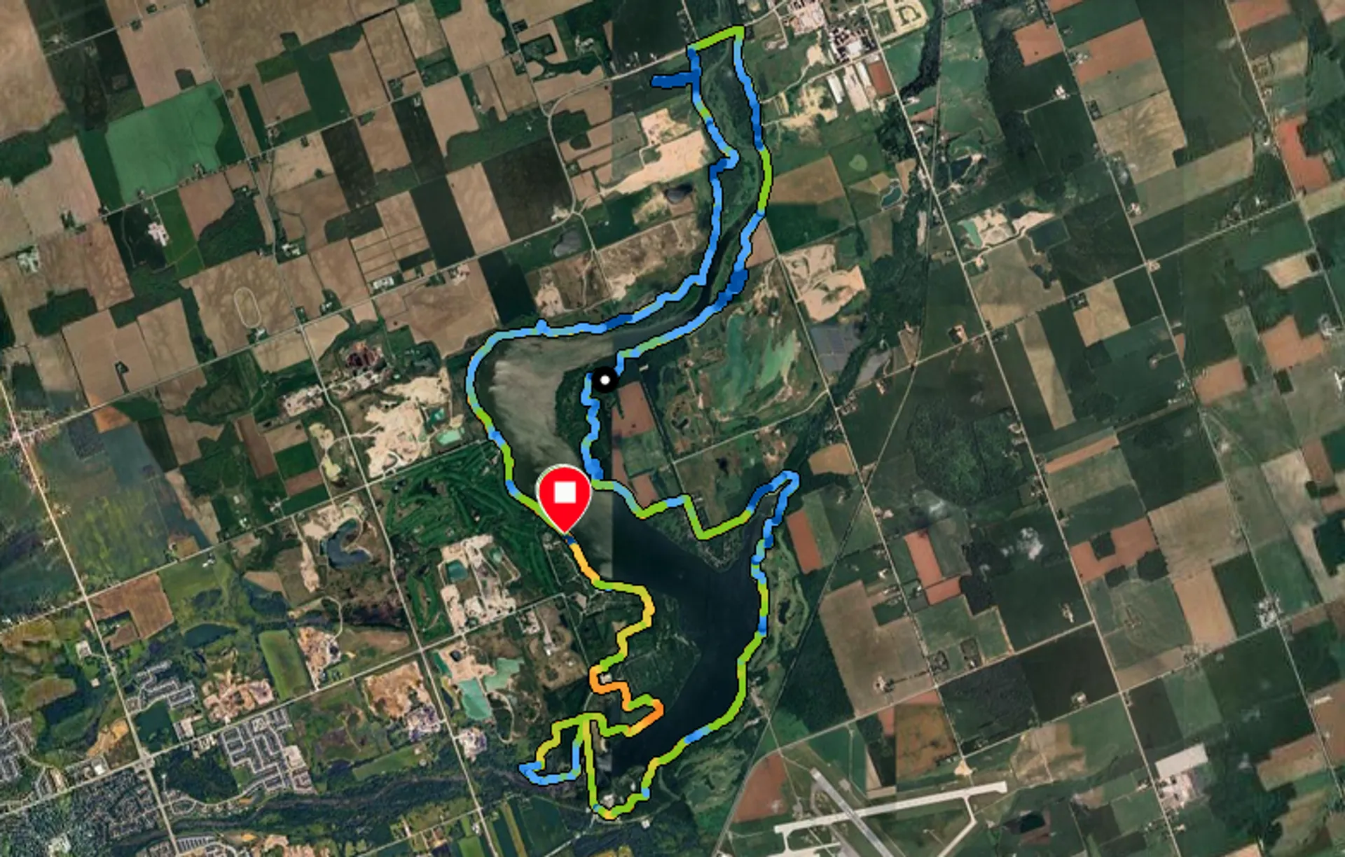 Der Lauf findet in der Fanshawe Conservation Area statt, einem Naherholungs- und Naturschutzgebiet am gleichnamigen Stausee nordöstlich von London. Die Strecke führt einmal um den See. Ein kleines bisschen Straße, ansonsten schöne Waldwege und Singletrails – mit ein paar fiesen Schleifen. Bei der Verpflegung kann der Lauf es fast mit dem Rennsteig aufnehmen. Allerdings ist hier das Wundermittel nicht Haferschleim, sondern schokolierter Bacon.