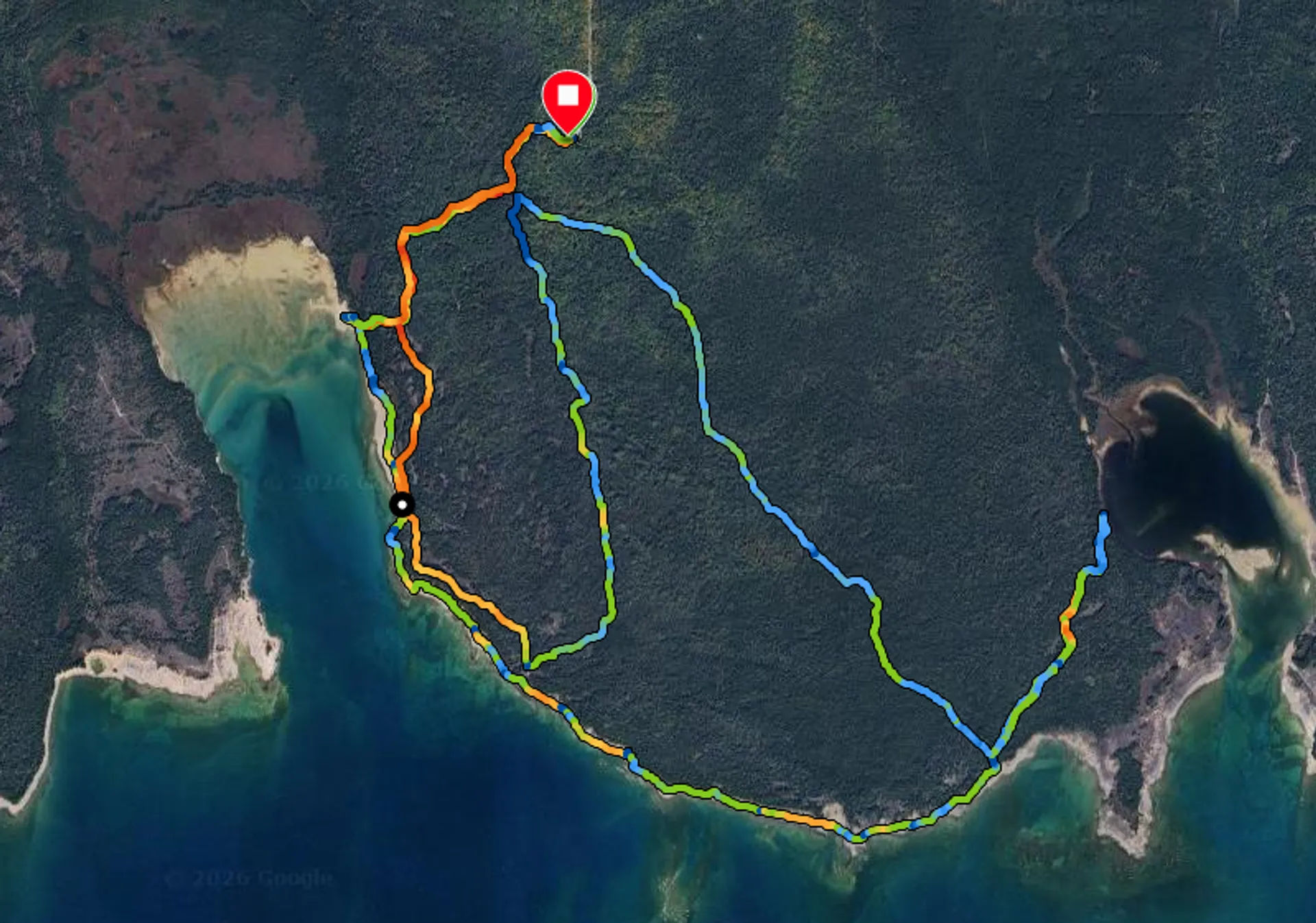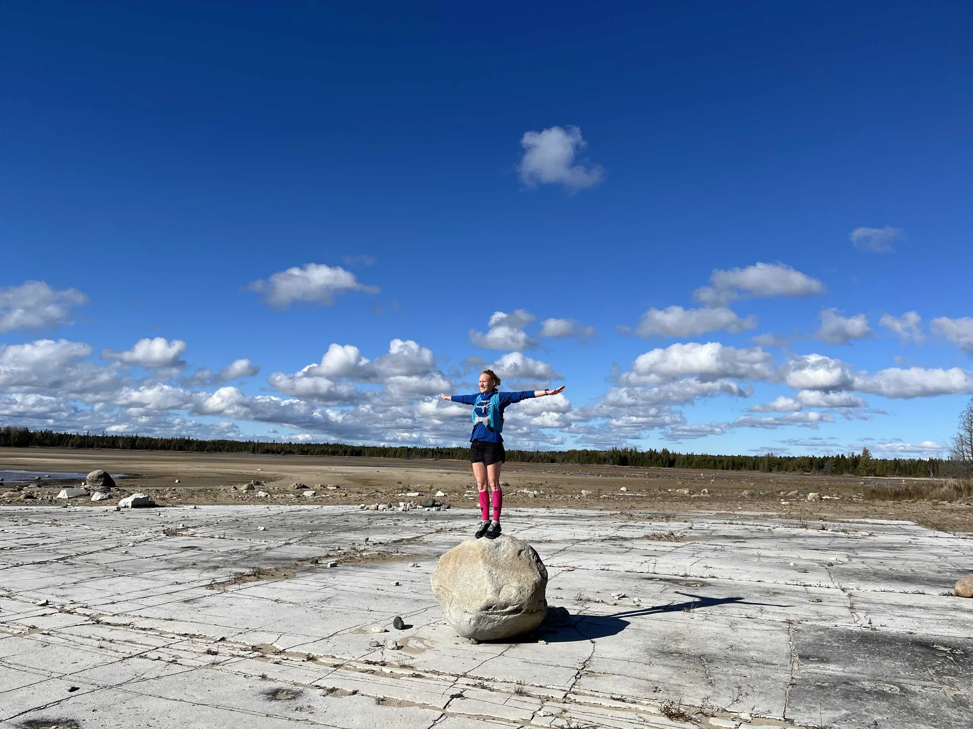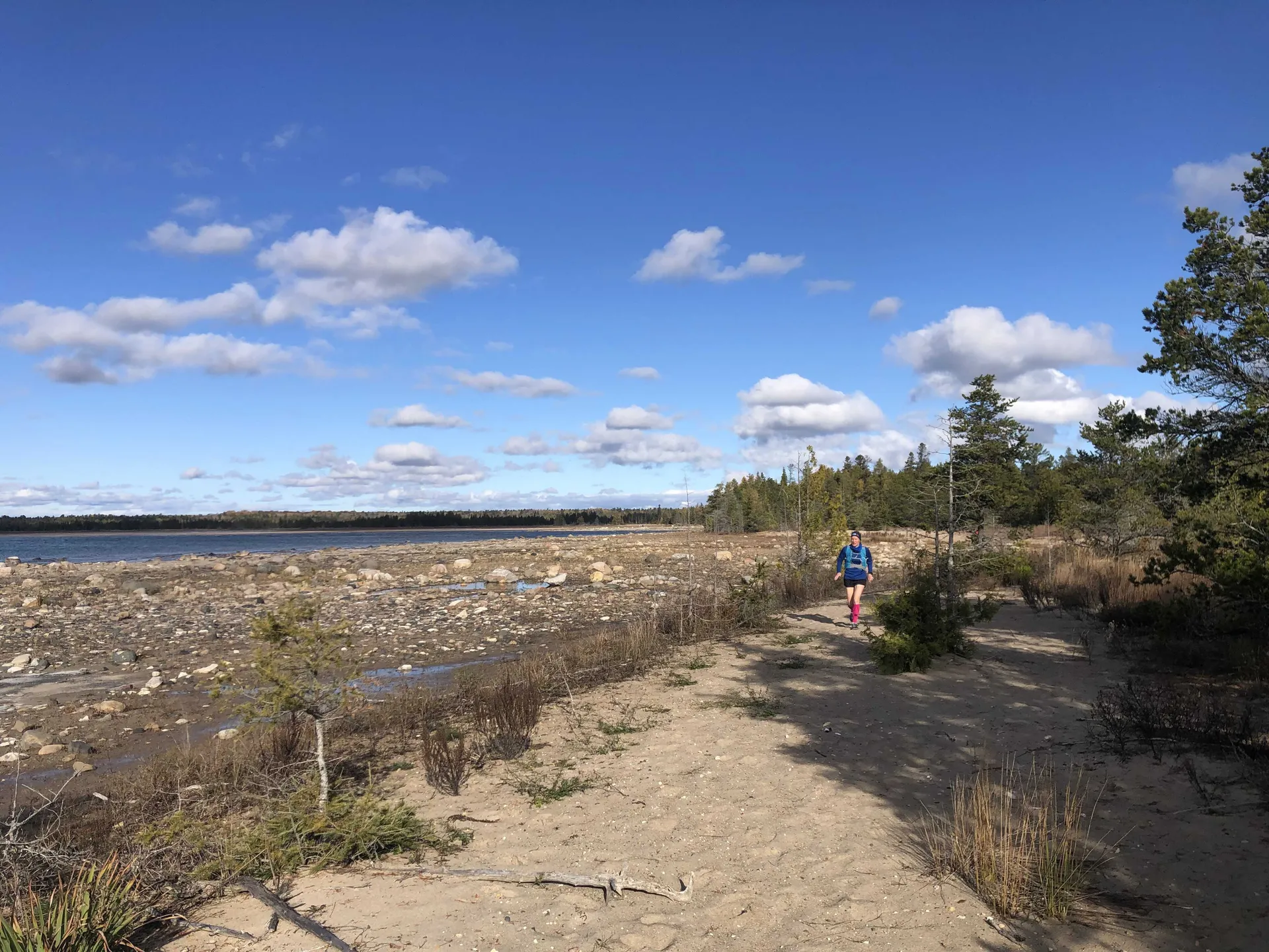 Was allerdings sehr sicher ist: Dies ist ein wunderbarer Fleck zum Laufen. Insgesamt gibt es 15 Kilometer Wanderwege, aufgeteilt auf vier ausgeschilderte Routen (blau, gelb, rot und orange). Wir haben drei davon (gelb, rot und orange) so kombiniert, dass wir auf insgesamt 17 Kilometer Strecke gekommen sind. Die Strecke ist komplett flach und auch die Routen sind gut ausgeschildert. Die Wege lassen sich toll laufen. Es gibt aber auch so viele schöne Aussichten, dass wir am Ende zwei Stunden unterwegs sind. Direkt am Wasser läuft man entweder über einen Sandstrand oder über den blanken Fels, der über die Jahrtausende von Gletschern und Wasser flach geschliffen wurde. Vom See weg geht es in dichte Wälder. Dort können sich dann auch die Knie vom harten Fels erholen. Ein Traum fürs Laufen und Wandern.