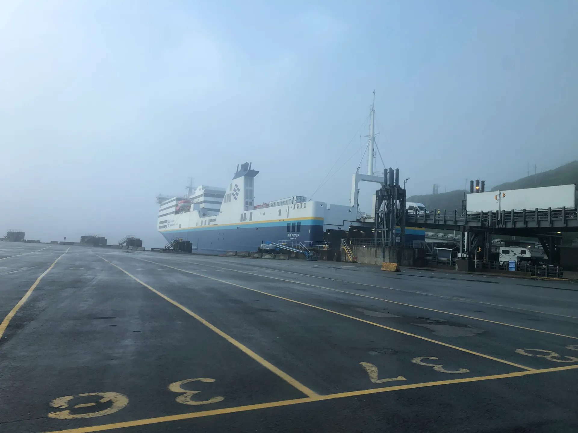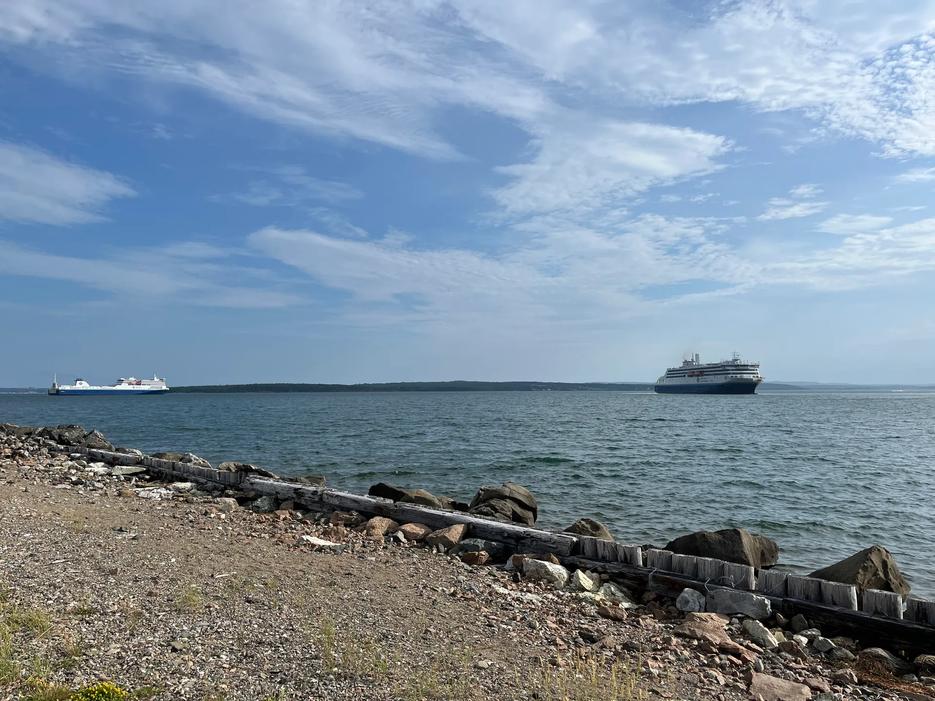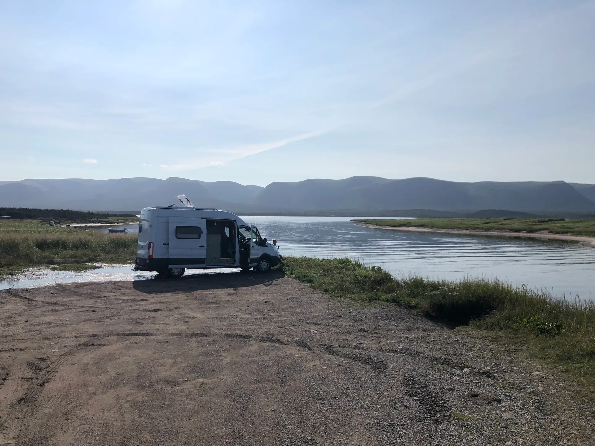 Uns wird mal wieder bewusst, dass Ferien sind. Die Fähren von Sydney Nord, Nova Scotia nach Port aux Basques, Newfoundland sind komplett ausgebucht. Anscheinend muss man im Frühjahr buchen, um seine Wunschzeit und eine Kabine zu bekommen. Letztere wollen wir eh nicht, und terminlich sind wir auch flexibel – nur irgendwann bis Ende Juli wäre schon schön. Nach mehreren Dutzend Versuchen schaffen wir es, einen anscheinend stornierten Platz zu bekommen. Wir haben zwei Sitzplätze auf der Nachtfähre, Abfahrt: 23 Uhr, Ankunft: 7 Uhr. Vor der Abfahrt haben wir am Indian Beach die Zeit überbrückt. Irgendwann haben dort drei Männer angefangen, Rock- und Countrymusik zu spielen. Scheint ein wöchentliches Event zu sein, da wenig später die Fans in ihren Autos kamen. Die sind nur nicht ausgestiegen. Wenn der Wind zu kalt ist, bleiben einfach alle im Auto sitzen – was wohl auch erklärt, warum die Boxen etwas übersteuert waren. Aber ein schöner Abschied von Nova Scotia. Die Fähre landet in Port aux Basques an. Das ist der südlichste Punkt von Neufundland. Es gibt auch eine Verbindung nach Argentia weiter im Osten – wäre auch eine Option, wenn man dort beginnen möchte und dann nach Westen fährt. Egal welche Verbindung, es gilt: so früh wie möglich buchen, vor allem in der Urlaubssaison oder wenn man in einer Kabine schlafen möchte. Zumindest konnte man die Sitze nach hinten kippen, und es war nicht eiskalt. Ich kann ja eh überall schlafen, Simon eher nicht so.