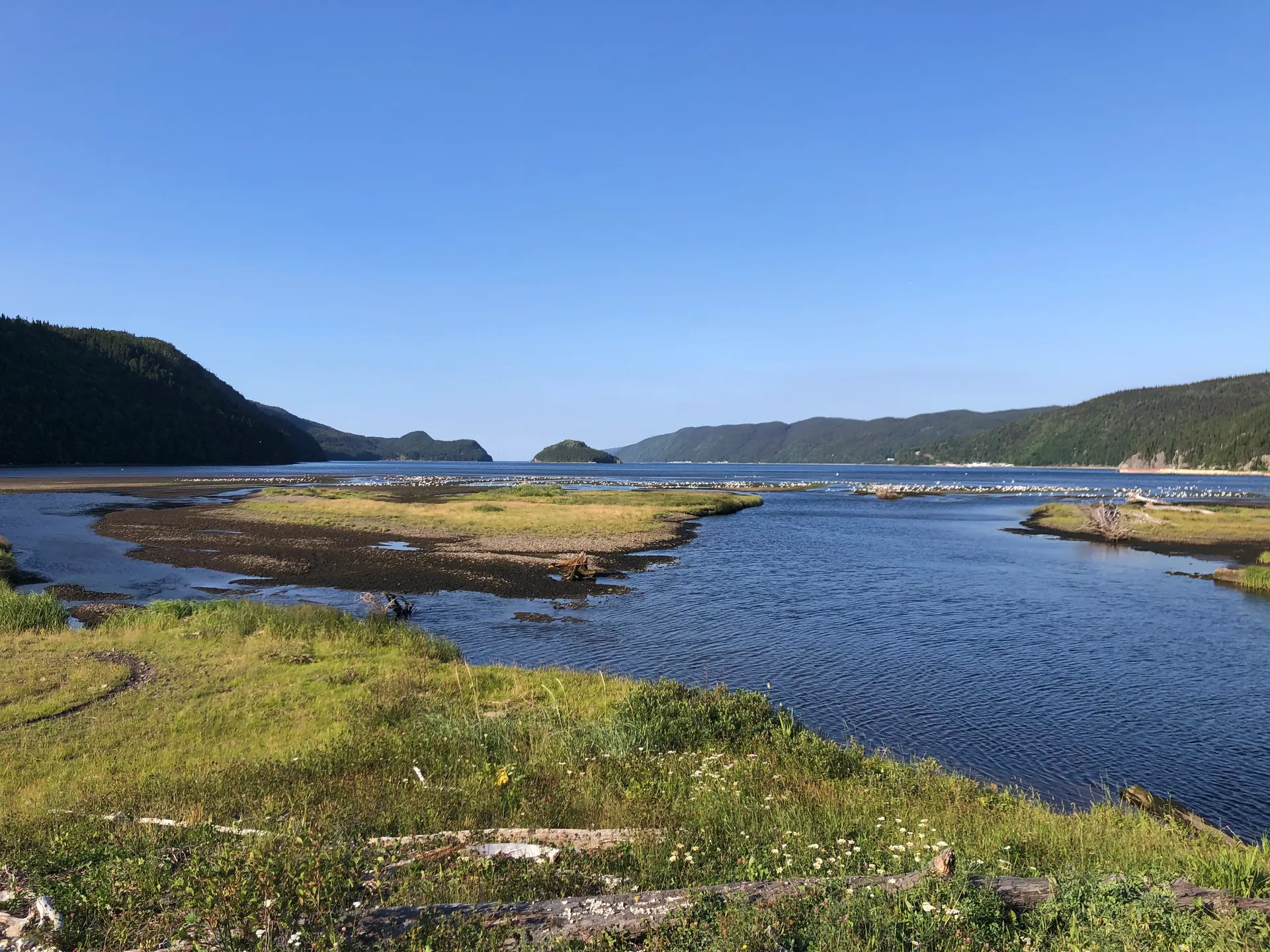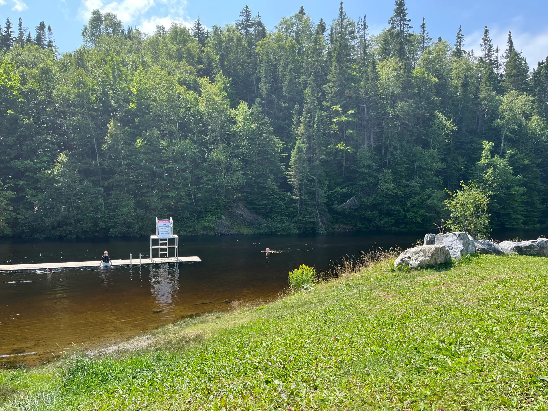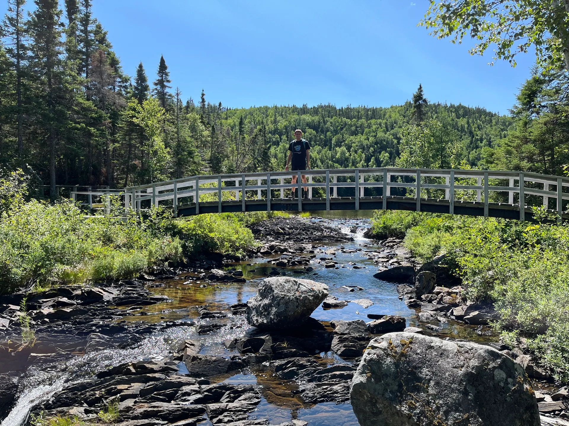 Deutschland braucht mehr Splash Pads! Öffentlich zugängliche Wasserspielplätze in Parks. Die gibt es hier in jeder größeren Stadt. Im Margaret Bowater Park in Corner Brook kann man sich auch wahlweise im Fluss erfrischen. Wir schlendern den ersten Abend in die Stadt auf der Suche nach einem Restaurant, um Fisch zu essen. Der etwas seltsame Typ, der uns auf der Straße anspricht, scheint etwas zu viel vom lokalen Craft Beer getrunken zu haben – aber über die Restaurants in Corner Brook weiß er Bescheid. Es gibt am Ende Fish and Chips und Fish Chowder, extrem lecker. Was auffällt, ist, dass es am Glynmill Pond überall Erinnerungsbäume gibt. Viele, anscheinend noch junge, Bäume und fast jede Bank haben Tafeln mit netten Worten an verstorbene Menschen. Die Parks sind auch tiptop in Schuss. Was wohl sowohl an der Security liegt, die bis 10 Uhr abends die Jugendlichen von Blödsinn abhält, als auch an den etwas älteren Jugendlichen, die als Putzkolonnen tagsüber durch die Parks streifen. Direkt hinter dem Parkplatz, auf dem wir stehen, fängt ein Mountainbike-Trail an. Fahrräder treffen wir nicht, dafür viele andere Läufer (12 km, 310 hm). Danach geht es ab in den Fluss. Wir entscheiden, zu bleiben, und hängen noch eine Nacht dran.