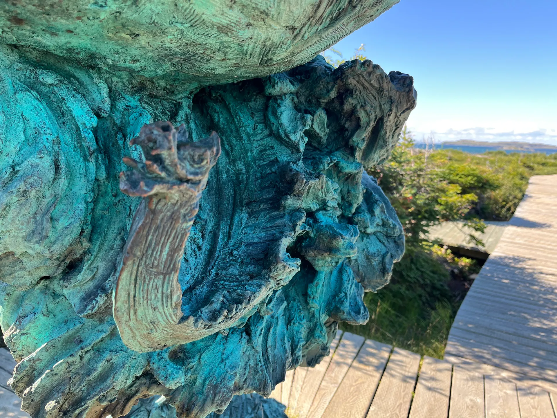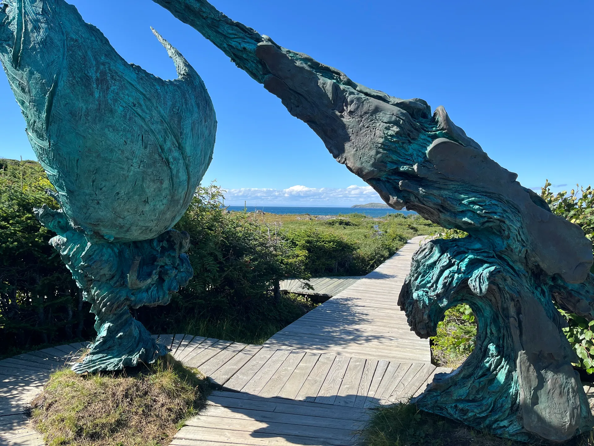 Ich hatte die Wikinger bereits im Reiseblog zu Bonavista erwähnt. An der Nordspitze von Neufundland wurden Reste einer Wikingersiedlung aus dem 11. Jahrhundert gefunden – die ältesten Spuren europäischer Siedler in Nordamerika. L’Anse aux Meadows National Historic Site bietet nicht nur eine tolle Ausstellung, sondern auch einen Nachbau von Teilen des Dorfes. Anstatt sich nur Infotafeln durchzulesen, kann man im Dorf mit als Wikingern verkleideten Mitarbeiterinnen und Mitarbeitern ins Gespräch kommen, die vom damaligen Alltag berichten. Das gesamte Areal ist seit 1978 UNESCO Weltkulturerbe. Die Wikinger, die hier in drei Abschnitten insgesamt nur rund zehn Jahre lebten, kamen nicht direkt aus Norwegen. Vielmehr waren sie Mitglieder einer Gruppe, die nach Island verbannt wurde und auf der Suche nach Bauholz über Grönland nach Neufundland gelangt ist. Das Gelände ist nicht allzu groß. Man kann zuerst die Ausstellung besuchen und anschließend einen Streifzug über das Außengelände machen. Wer Zeit hat, sollte den kleinen Spaziergang am Wasser entlang unternehmen und ein kleines Geschenk für die Feen mitbringen, deren Häuser überall am Wegesrand stehen. Eine kurze Autofahrt von L’Anse aux Meadows entfernt befindet sich eine Statue von Leif Erikson, der die erste Expedition nach Neufundland geführt hat. Diese Statue ist die neueste in einem Quartett identischer Standbilder in Trondheim (Norwegen), Brattahlid (Grönland), Seattle (USA) und hier. Die erste Statue wurde 1936 in Seattle von August Werner, einem Professor für Musik an der University of Washington, errichtet. Sie sollte ein Zeichen der großen skandinavisch-amerikanischen Gemeinschaft in Seattle sein. Die anderen Orte haben tatsächliche historische Verbindungen zu Leif Erikson oder seinem Vater Erik Thorvaldsson.