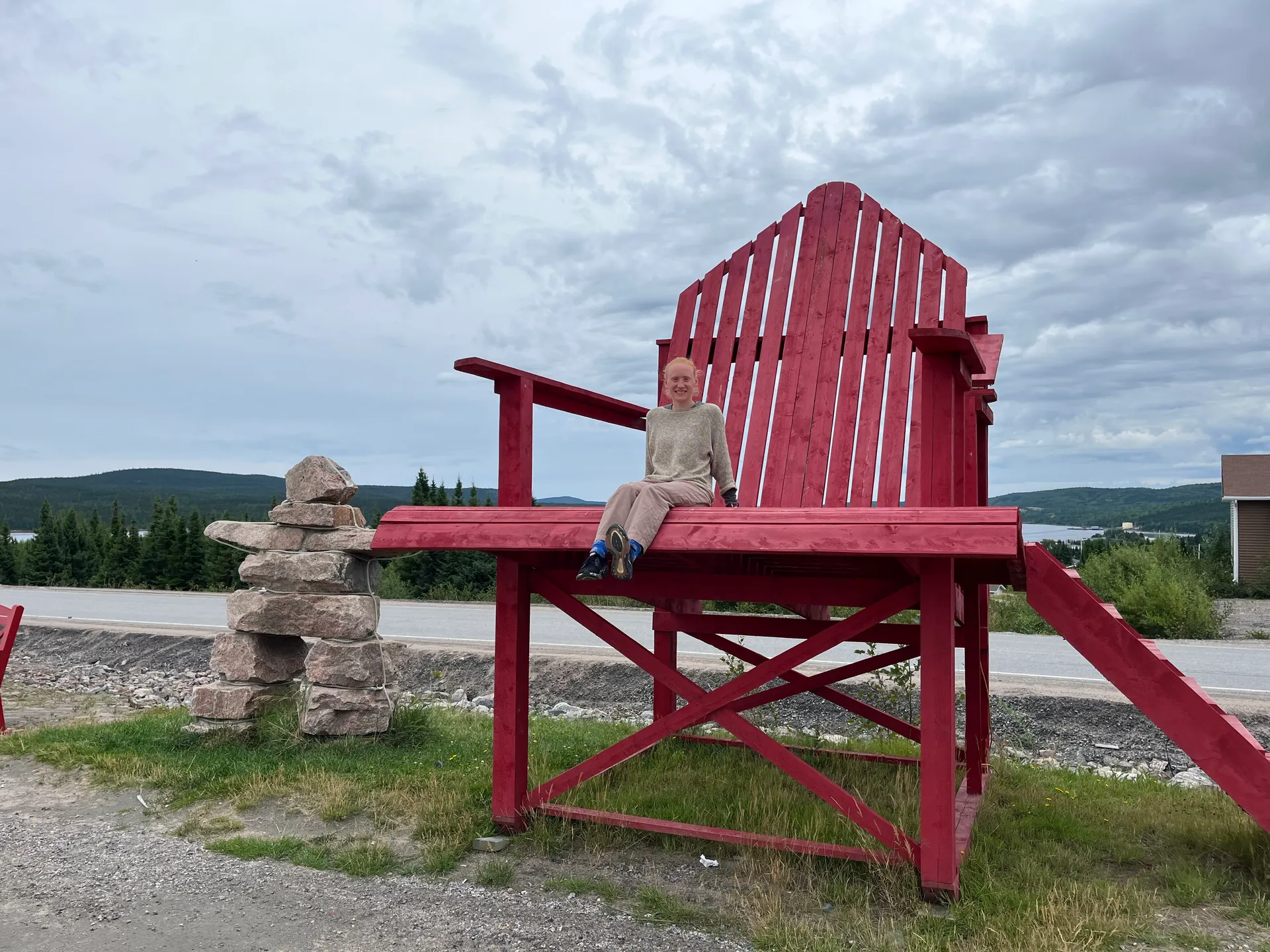 Wir übernachten am Dorfrand an einem See und machen uns am nächsten Tag auf den längsten Abschnitt des Highways ohne Tankstellen oder Dörfer. Die Sehenswürdigkeit des Dorfes ist der riesige rote Stuhl an der Tankstelle. Er ist der größte in unserer Fotosammlung und lässt selbst den Panda klein aussehen.