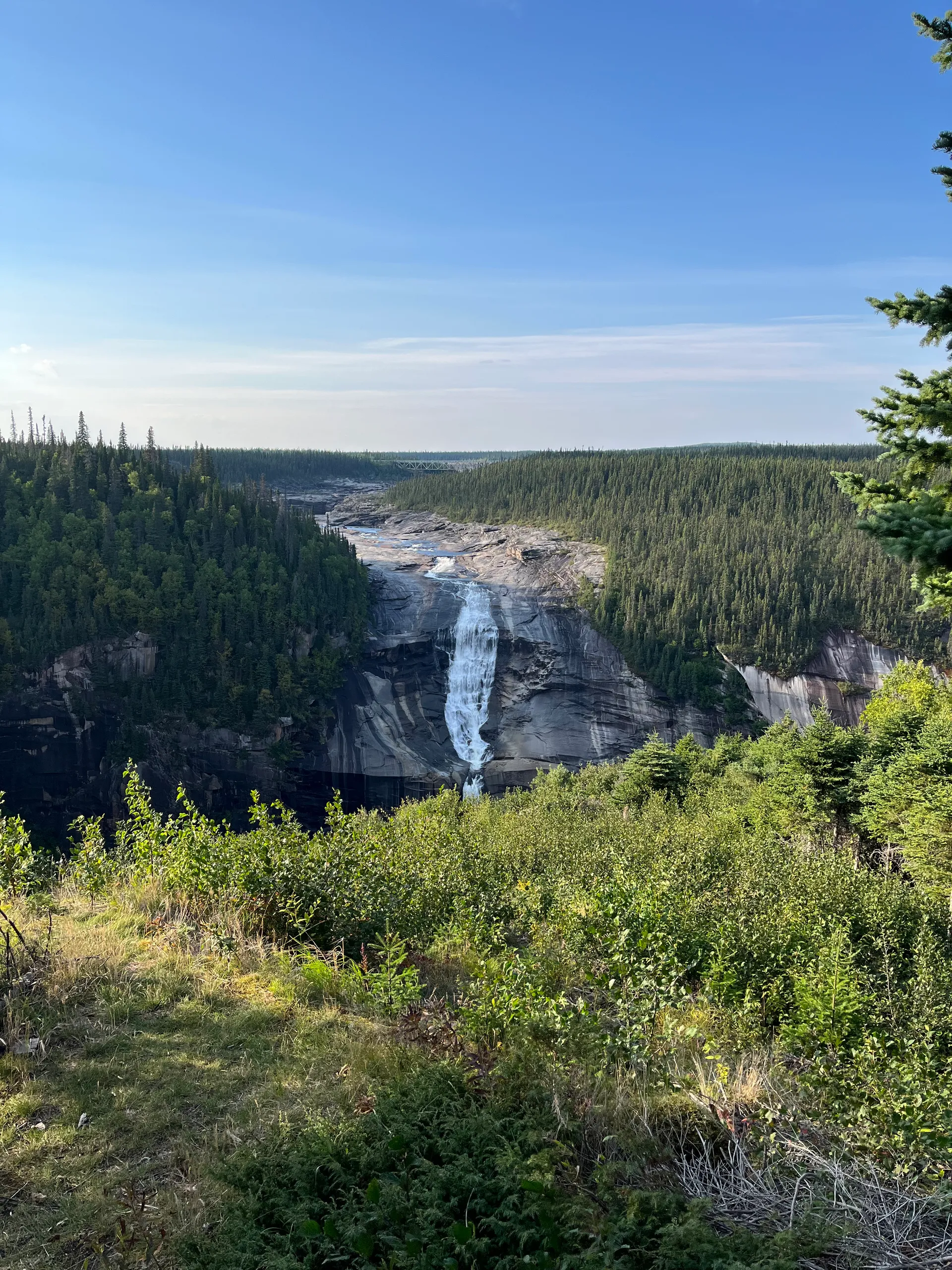 Wir übernachten auf dem Parkplatz des Lifts und gehen am Morgen noch eine Runde schwimmen, bevor wir weiter Richtung Labrador City fahren. Kurz hinter dem Flughafen und der einspurigen Brücke fahren wir links auf den Wanderparkplatz und spazieren zum Aussichtspunkt um den Wasserfall zu sehen.