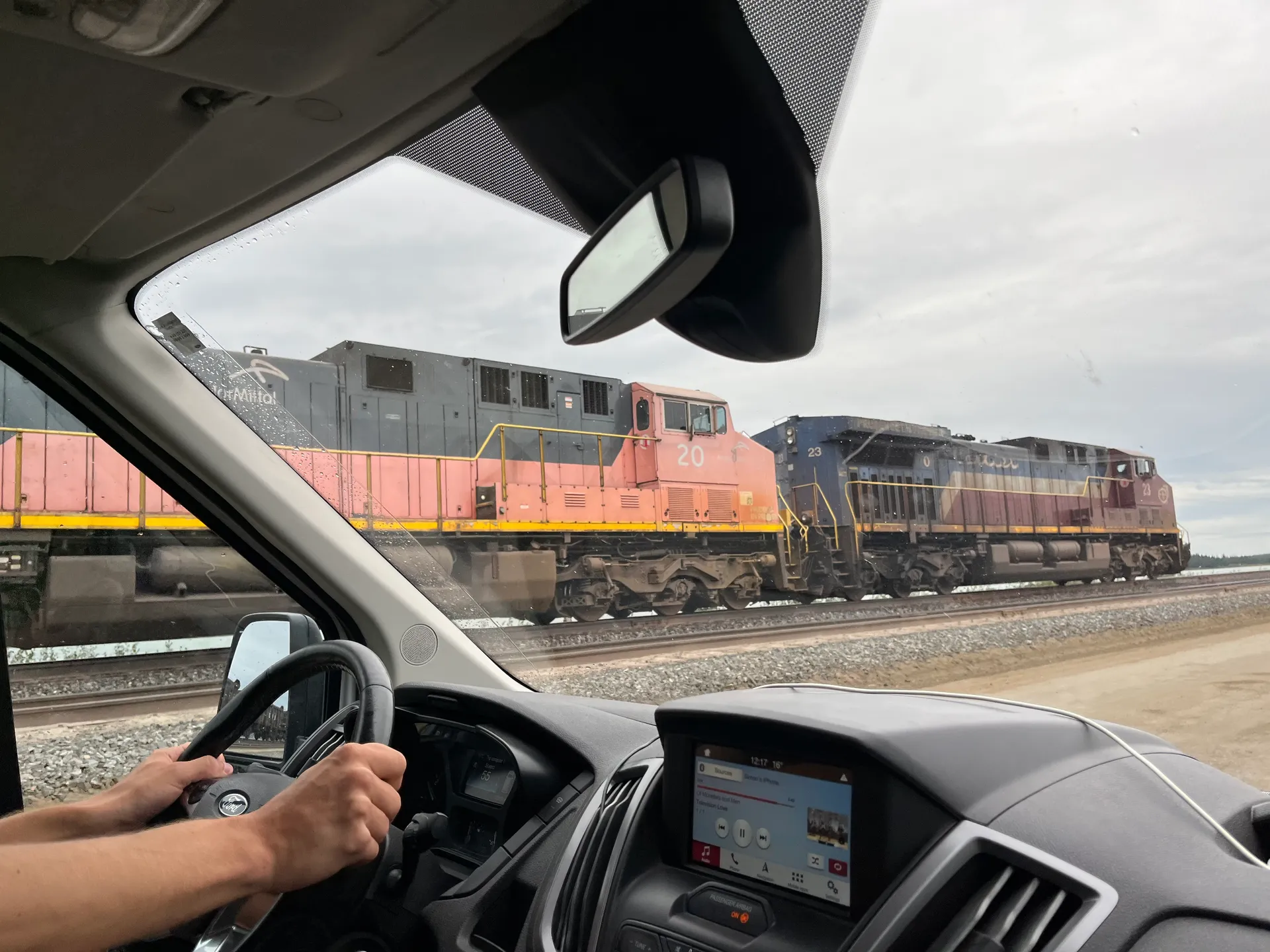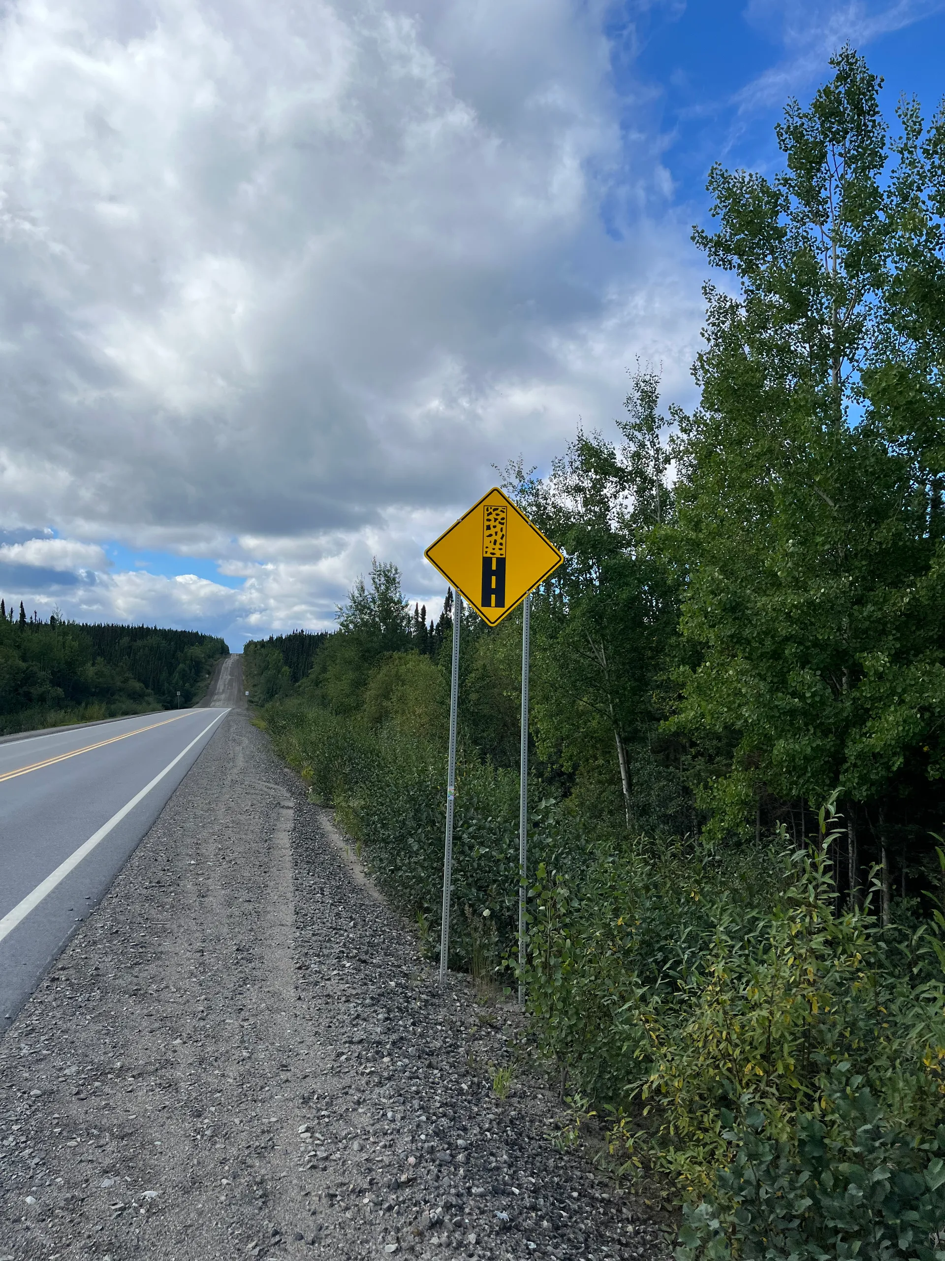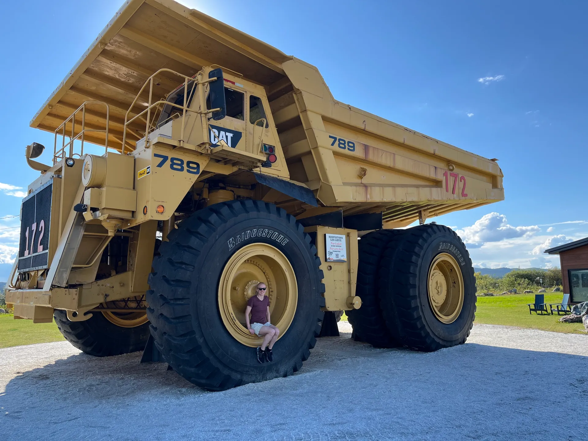 Verlässt man Fermont nach Westen, fährt man direkt in die Ausläufer des Tagebaus Mont-Wright. Man kann sowohl das große Loch im Boden erahnen als auch den Aushub sehen, der sich als künstliche Berge auftürmt. Schilder am Straßenrand warnen vor den riesigen Kippern, und am Straßenrand türmen sich die ausgemusterten Reifen mit mehr als 2 m Durchmesser. Hier beginnt auch der erste unbefestigte Straßenabschnitt mit 67 km Länge. Es ist aber keine tiefe Schotterpiste, sondern eher ein sehr gut verdichteter, zweispuriger Feldweg. Trotzdem ist Vorsicht geboten. Wenn man von einem LKW überholt wird, sollte man am besten rechts ranfahren und abwarten, bis er vorbei ist. Den Fahrern sind die Geschwindigkeitsbegrenzungen nämlich genauso egal wie die Gefahr, dass sie einem ein Stein die Windschutzscheibe jagen. Bleibt die Frage, warum nach über 1.000 km durch Labrador ausgerechnet hier die Straße nicht ausgebaut wurde. Dabei gab es 2018 ein großes Projekt, um die 389 auszubauen.