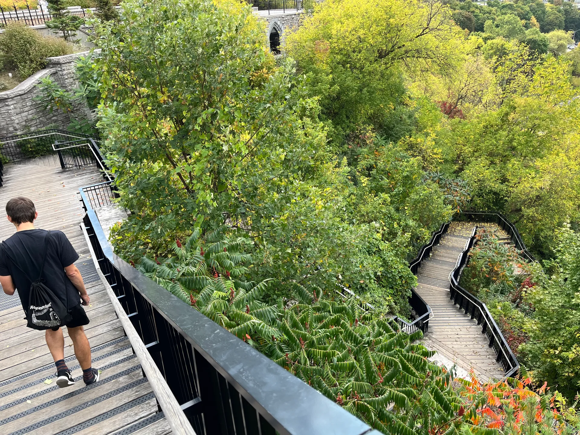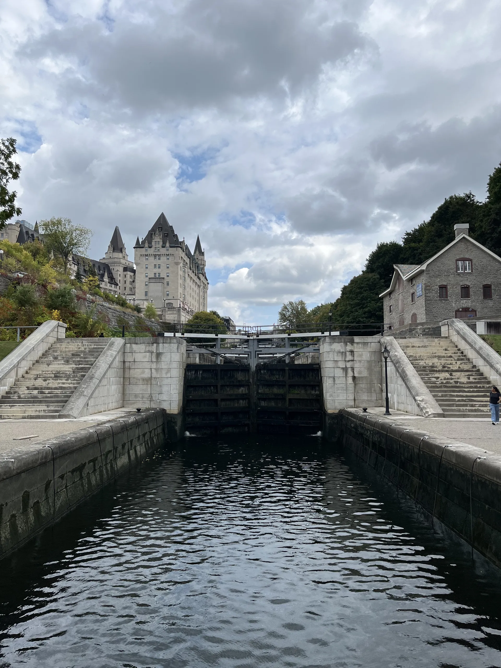 Der Einfluss der britischen Architektur auf das Parlamentsgebäude ist unübersehbar. Zusammen mit der Statue von Queen Victoria kann man sich kurz wundern, dass nicht der Union Jack über dem Gebäude weht. Parliament Hill thront auf einer Anhöhe über dem Ottawa-Fluss und beherbergt das kanadische Parlament sowie verschiedene Regierungsgebäude. Die großzügigen Parkanlagen laden zum Spazieren ein. Die Rückseite des Parlaments bietet nicht nur einen Blick auf die architektonisch wunderschöne Bibliothek, sondern auch hinüber zur Schwesterstadt Gatineau in Québec. Von hier aus kann man hinunter auf Flussniveau steigen und bis zur Mündung des Kanals in den Ottawa-Fluss laufen. Hier wird einem plötzlich bewusst, dass der Kanal auf nur 400 Metern über acht Schleusen 22 Höhenmeter überwinden muss. Wir nutzen eine der Schleusen, um auf die andere Seite des Kanals zu kommen. Auf der anderen Seite liegt die National Gallery of Canada mit einem tollen Skulpturenpark.