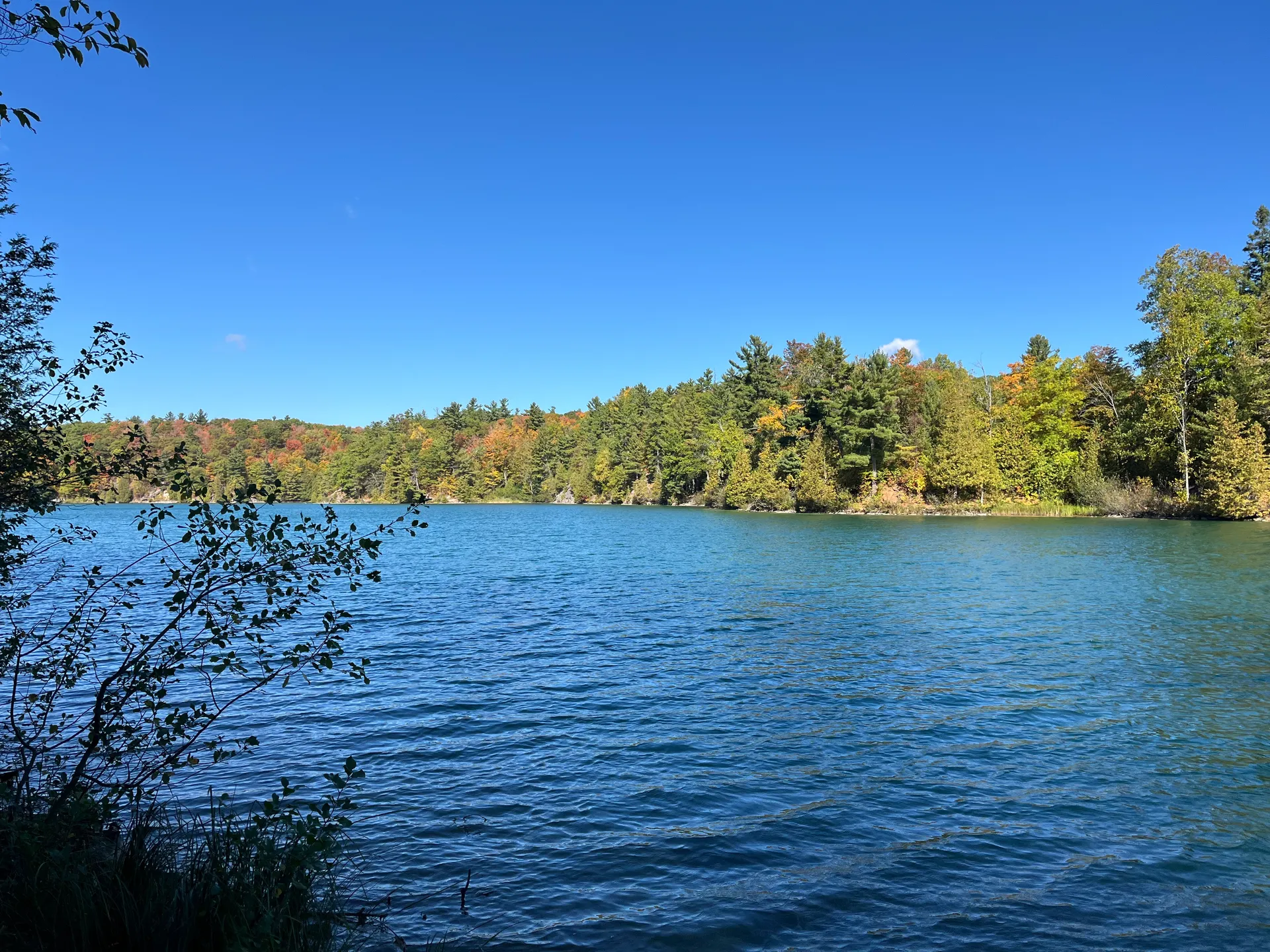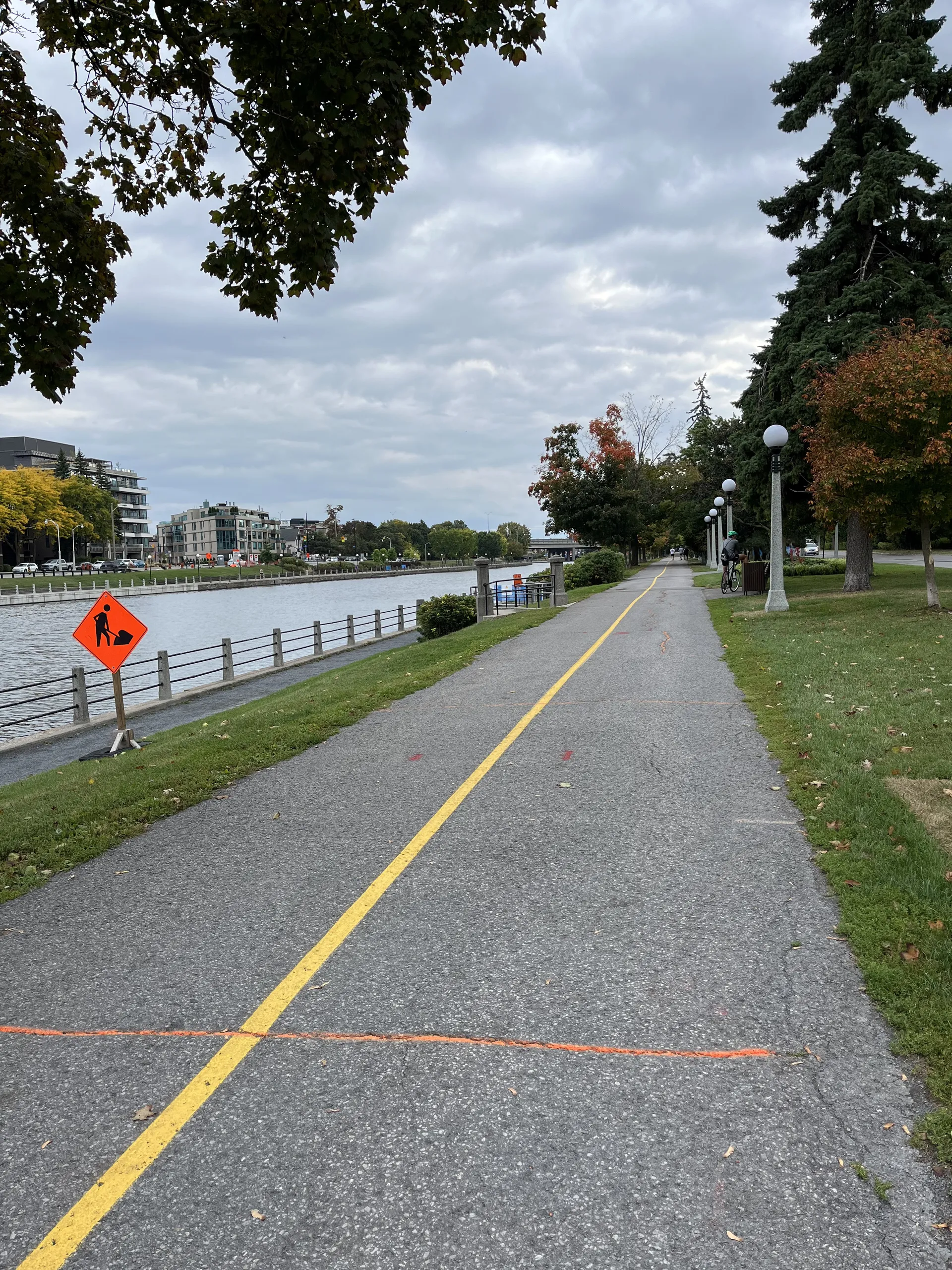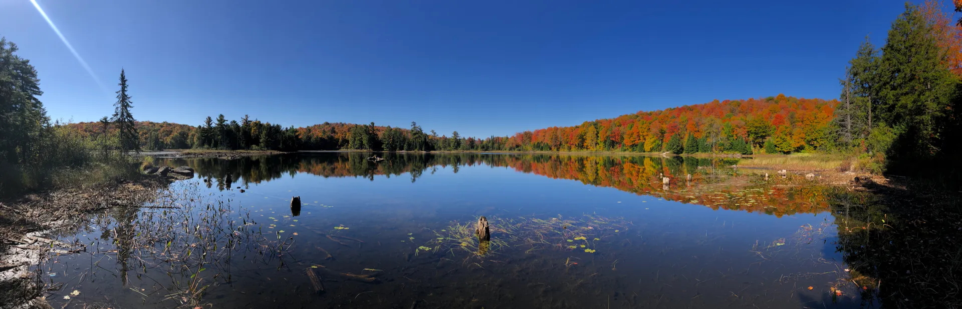 Eigentlich stand das nicht auf unserem Plan, aber nachdem uns mehrfach der Gatineau Park empfohlen wurde, machen wir noch einmal einen Abstecher zurück nach Québec. Wir wählen Old Chelsea als Ausgangspunkt aus. Der Parkplatz der örtlichen Verwaltung ist am Wochenende für die Öffentlichkeit freigegeben. Wir kommen am Samstagnachmittag an und können hier bis Montagmorgen 7 Uhr stehen bleiben. Am Vormittag sind einige der Straßen im Park für den Autoverkehr gesperrt – ein Paradies für Fahrradfahrer. Wir verfahren uns und finden den Pink Lake erst, nachdem wir die Räder 50 Meter durch einen Wald getragen haben. Es ist Wochenende und es ist voll, aber noch nicht überfüllt. Der Pink Lake ist tatsächlich in einem schönen Grün gehalten. Der Name stammt von den irischen Siedlern der 1820er-Jahre. Die Besonderheit des Sees befindet sich unter der Wasseroberfläche: Pink ist der See nur auf den unteren sieben Metern. Diese Schicht ist von rosafarbenen, photosynthetisch aktiven Bakterien geprägt, die anstelle von Wasser Schwefelwasserstoff oder Sulfit-Ionen zur Photosynthese nutzen. Somit wird auch kein Sauerstoff, sondern Schwefel freigesetzt. Die untersten sieben Meter des Sees sind deshalb frei von Sauerstoff und durch einen Bakterienteppich von der oberen, sauerstoffreichen Schicht getrennt. Durch die spezielle Topographie des Sees mischen sich die beiden Schichten nie. Ein fragiles System. Wir fahren noch etwas mit den Rädern durch den Park und steigen zu einem Aussichtspunkt hinauf, von dem aus man bis nach Ottawa schauen kann. Langsam wird es Herbst, und der Laubwald leuchtet in Gelb und Orange. Da wir am nächsten Morgen ohnehin früh raus müssen, um das Auto umzuparken, planen wir noch einen Lauf. Ich fühle mich wie zu Hause im Teutoburger Wald. Schöne Waldwege, bunte Blätter an den Bäumen und ein paar schöne Anstiege auf 24 Kilometern, die fast ohne Straßen auskommen. Hier kann man wirklich eine Pause zwischen den Großstädten einschieben.