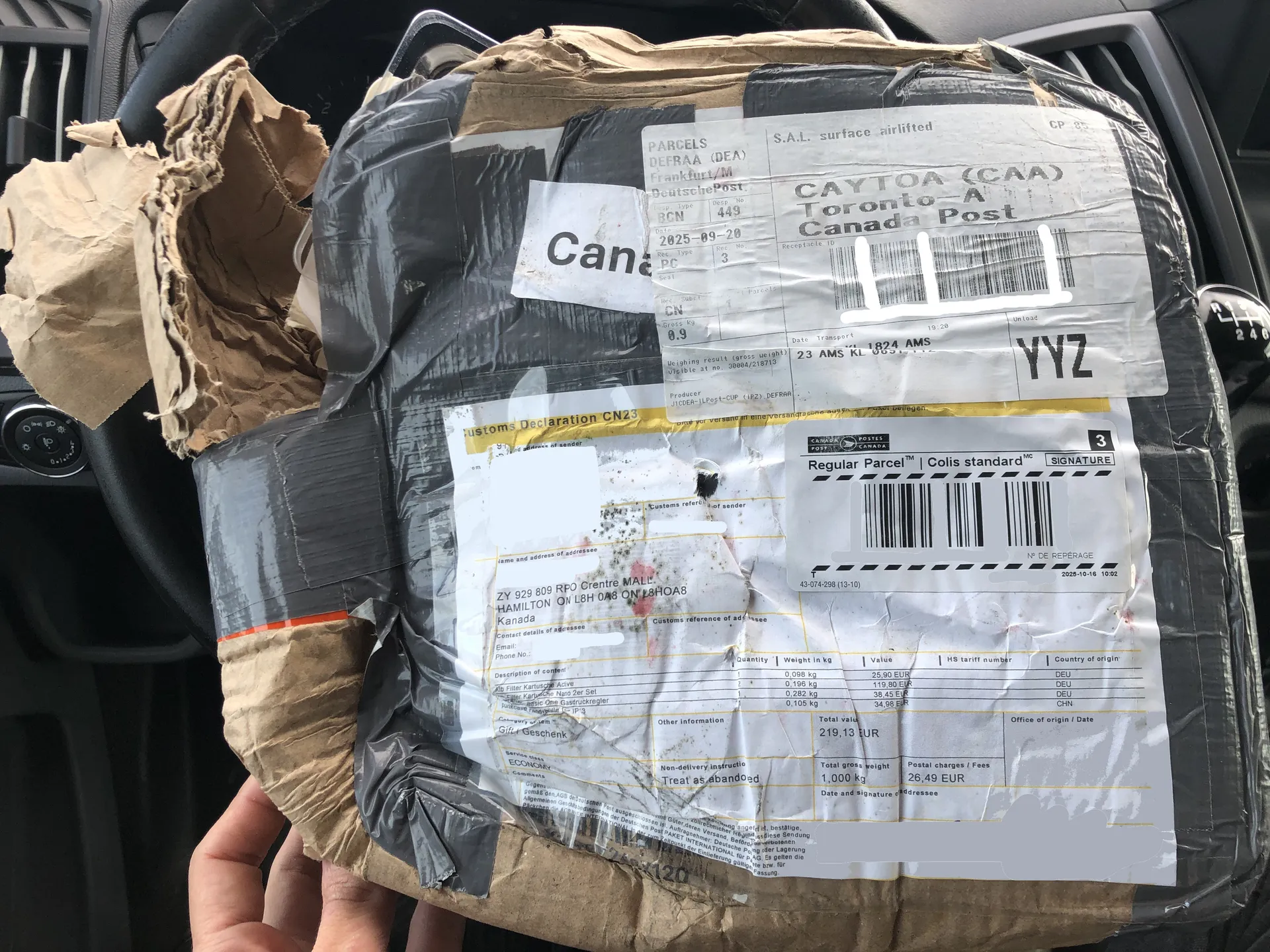 Die Gewerkschaft der kanadischen Post ist gut vernetzt und streikfreudig. Am 25. September eskaliert ein Streit über eine vom zuständigen Minister angekündigte Reform des Postwesens. Es sollen Kosten eingespart werden, indem entlegene Poststellen geschlossen oder zusammengelegt werden. Die Gewerkschaft ruft zu einem landesweiten Streik auf und der Brief- und Paketverkehr steht still. Auch unser Paket steckt fest. Wir verfolgen, wie es aus Franken nach Amsterdam kommt und schließlich nach Toronto fliegt. Wir entscheiden uns, einfach ein bisschen Süd-Ontario zu erkunden und zu hoffen, dass der Streik früh genug vorbei ist. Am 10. Oktober wechselt die Gewerkschaft zu einem rotierenden Streik. Jede Woche wird irgendwo anders gestreikt. Irgendwann sehen wir, dass das Paket in der Poststelle angekommen ist, zu der wir es geschickt haben, und fahren auf Verdacht hin. Die nächste Hürde: Eigentlich ist es nicht vorgesehen, Pakete direkt an Poststationen zu schicken, wenn man keine kanadische Adresse hat. Dieses Mal lässt man es uns durchgehen, aber nicht noch einmal. Ist für uns okay. Dann bekommen wir endlich unser Paket. Es steckt völlig durchnässt und mit Stockflecken in einer Plastiktüte, auf der sich die kanadische Post für den Zustand entschuldigt. Man habe es so in der Paketverarbeitung vorgefunden. Zum Glück war alles doppelt verpackt. Soviel zu unserer Erfahrung mit Canada Post.