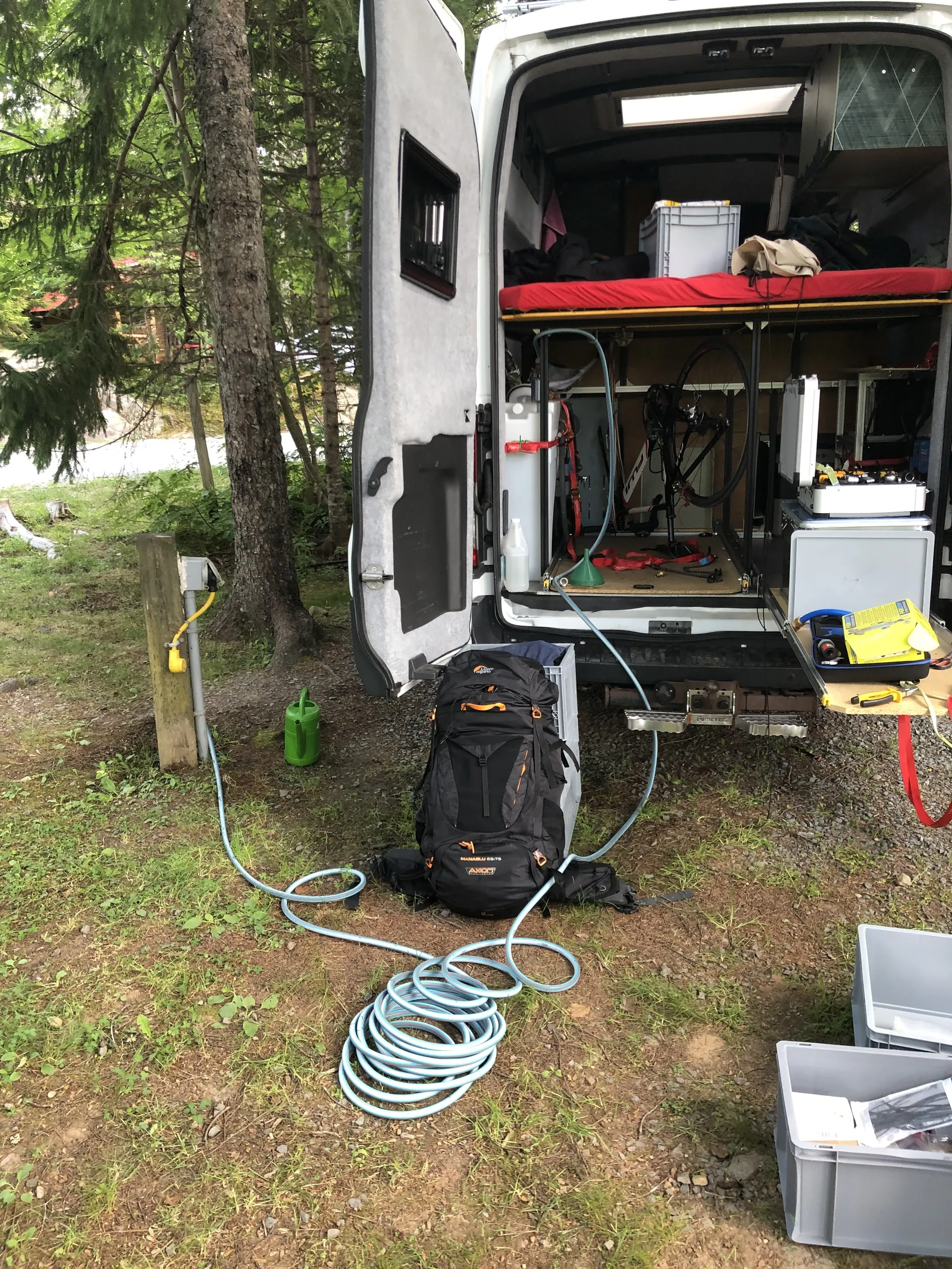 Wir haben uns zwei Nächte auf einem Campingplatz eingemietet, um erst mal klar Schiff zu machen und anzukommen. Campingplatz heißt hier: Strom, fließend Wasser, ein Tisch mit Bänken und eine Feuerstelle an allen Stellplätzen. Die Mücken sind mit Blick auf den See allerdings auch inklusive. Camping heißt hier aber auch: 15 m lange Trailer, die von Pickups gezogen werden, die so lang sind wie unser Panda (6 m). Wenn die stehen, fahren sie dann auch noch Erweiterungen zur Seite aus und werden direkt ans Abwasser angeschlossen. Kann man machen – aber warum? Zum Glück werden wir im Laufe der Reise auch noch Campern begegnen, die eher unsere Maße haben.