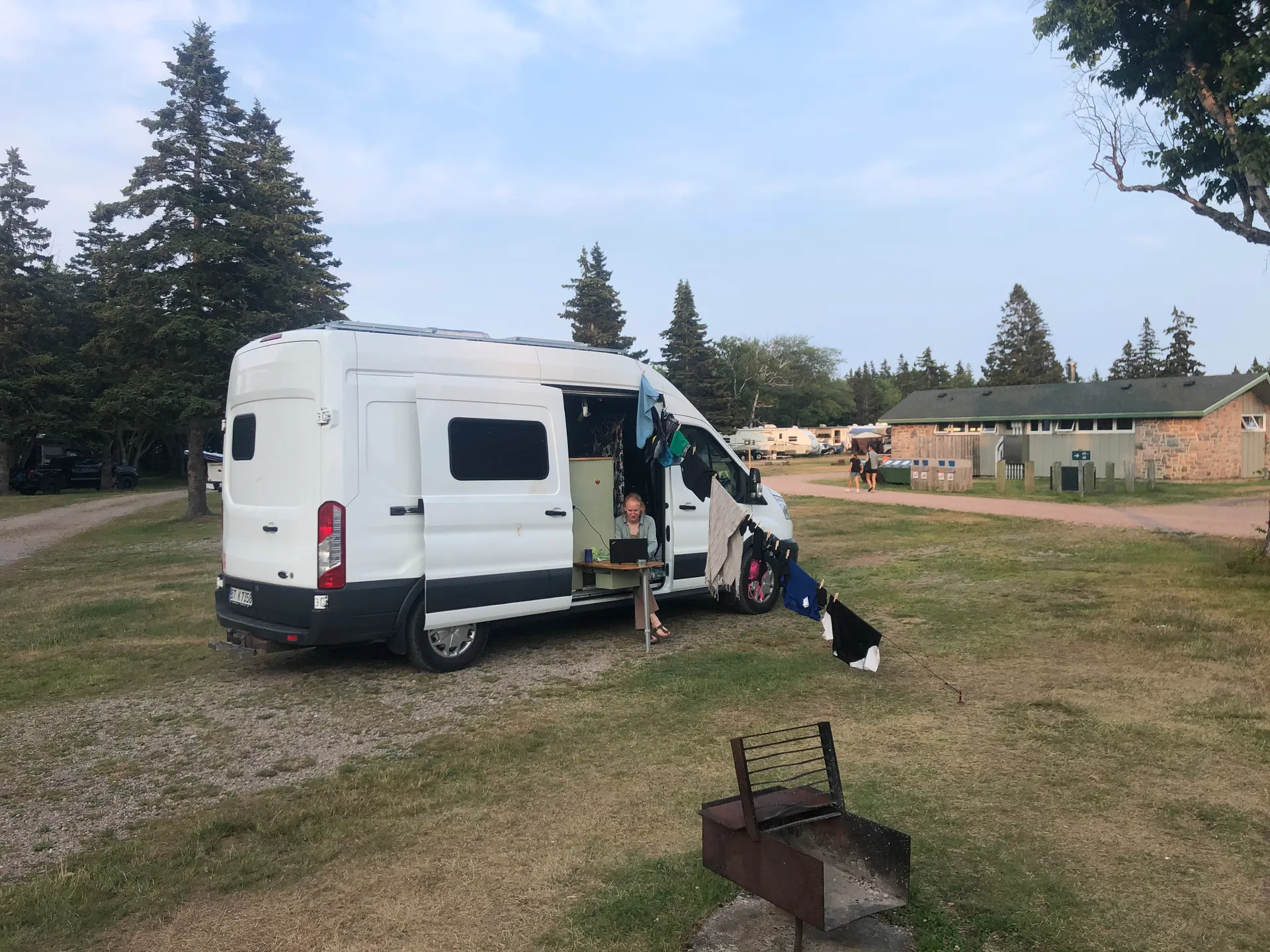 Wie oben schon geschrieben, sind die Campingplätze rappelvoll. Wir haben noch je eine Nacht auf dem Broad Cove und dem Chéticamp Campingplatz im Nationalpark bekommen. Rappelvoll heißt hier aber nicht, dass es irgendwie eng wäre und man sich zwischen den Campern durchschieben müsste. Die Plätze sind großzügig geschnitten und alle mit eigener Feuerstelle und Sitzbank ausgestattet. Wenn man irgendwann herausgefunden hat, wie die kanadischen Duschregler funktionieren, ist das Wasser auch warm. Einfach so lange weiterdrehen, bis es warm wird – man kann nur die Temperatur, nicht die Wassermenge steuern.