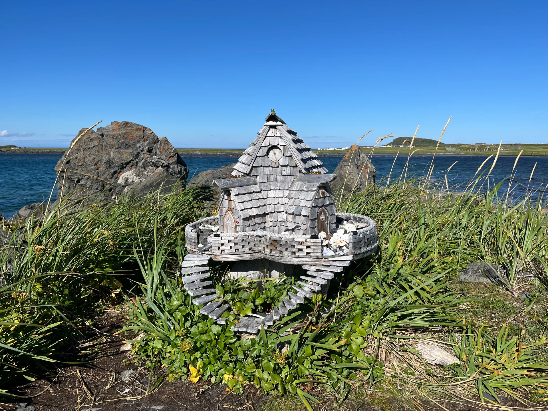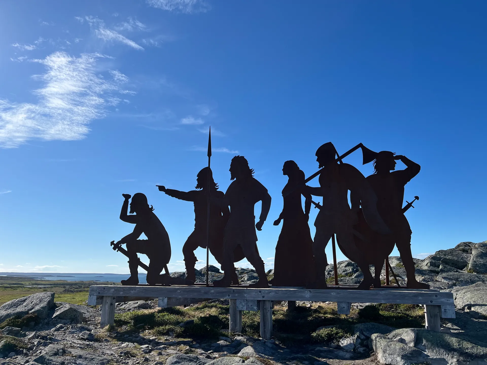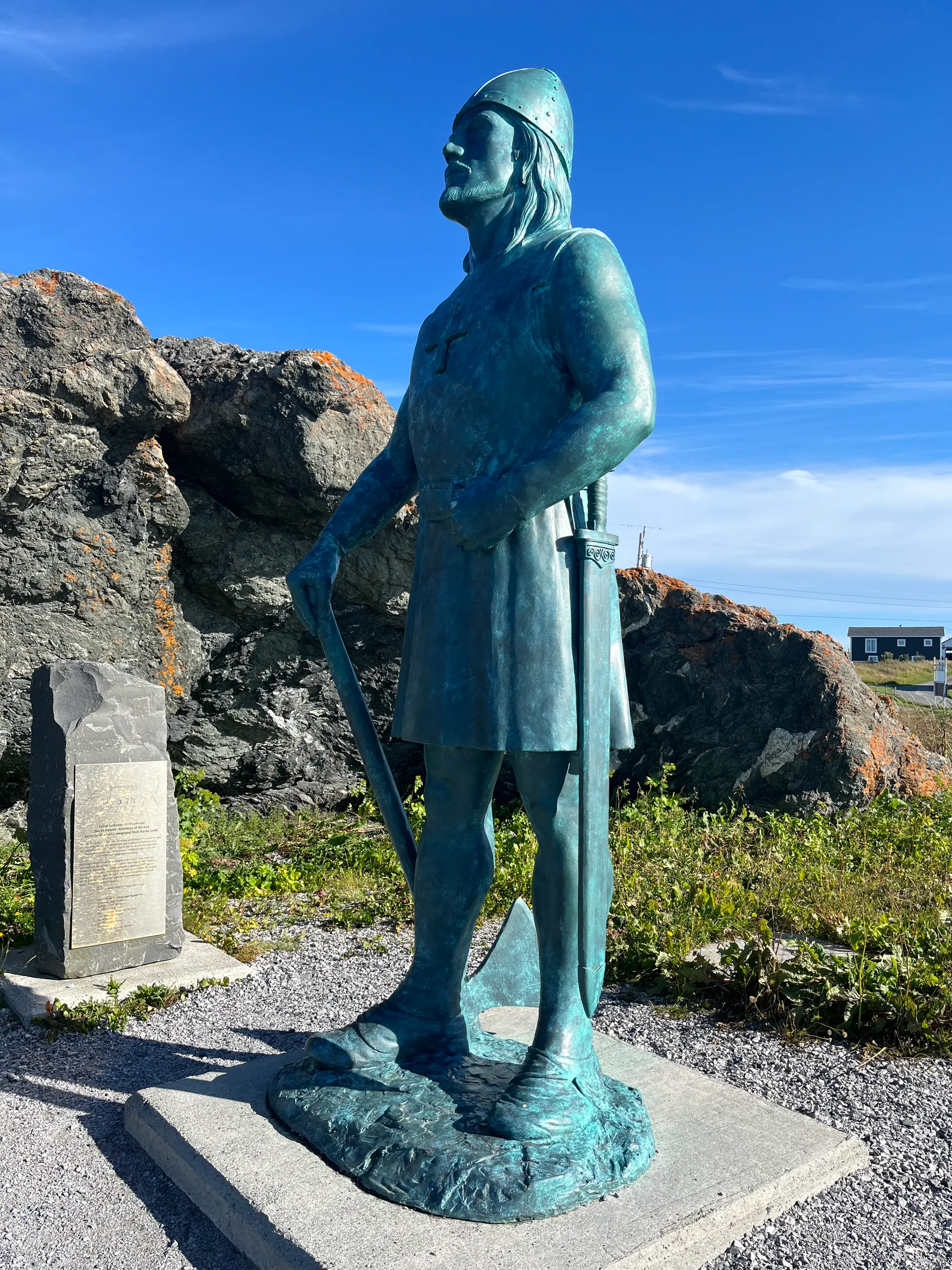 Ich hatte die Wikinger bereits im Reiseblog zu Bonavista erwähnt. An der Nordspitze von Neufundland wurden Reste einer Wikingersiedlung aus dem 11. Jahrhundert gefunden – die ältesten Spuren europäischer Siedler in Nordamerika. L’Anse aux Meadows National Historic Site bietet nicht nur eine tolle Ausstellung, sondern auch einen Nachbau von Teilen des Dorfes. Anstatt sich nur Infotafeln durchzulesen, kann man im Dorf mit als Wikingern verkleideten Mitarbeiterinnen und Mitarbeitern ins Gespräch kommen, die vom damaligen Alltag berichten. Das gesamte Areal ist seit 1978 UNESCO Weltkulturerbe. Die Wikinger, die hier in drei Abschnitten insgesamt nur rund zehn Jahre lebten, kamen nicht direkt aus Norwegen. Vielmehr waren sie Mitglieder einer Gruppe, die nach Island verbannt wurde und auf der Suche nach Bauholz über Grönland nach Neufundland gelangt ist. Das Gelände ist nicht allzu groß. Man kann zuerst die Ausstellung besuchen und anschließend einen Streifzug über das Außengelände machen. Wer Zeit hat, sollte den kleinen Spaziergang am Wasser entlang unternehmen und ein kleines Geschenk für die Feen mitbringen, deren Häuser überall am Wegesrand stehen. Eine kurze Autofahrt von L’Anse aux Meadows entfernt befindet sich eine Statue von Leif Erikson, der die erste Expedition nach Neufundland geführt hat. Diese Statue ist die neueste in einem Quartett identischer Standbilder in Trondheim (Norwegen), Brattahlid (Grönland), Seattle (USA) und hier. Die erste Statue wurde 1936 in Seattle von August Werner, einem Professor für Musik an der University of Washington, errichtet. Sie sollte ein Zeichen der großen skandinavisch-amerikanischen Gemeinschaft in Seattle sein. Die anderen Orte haben tatsächliche historische Verbindungen zu Leif Erikson oder seinem Vater Erik Thorvaldsson.