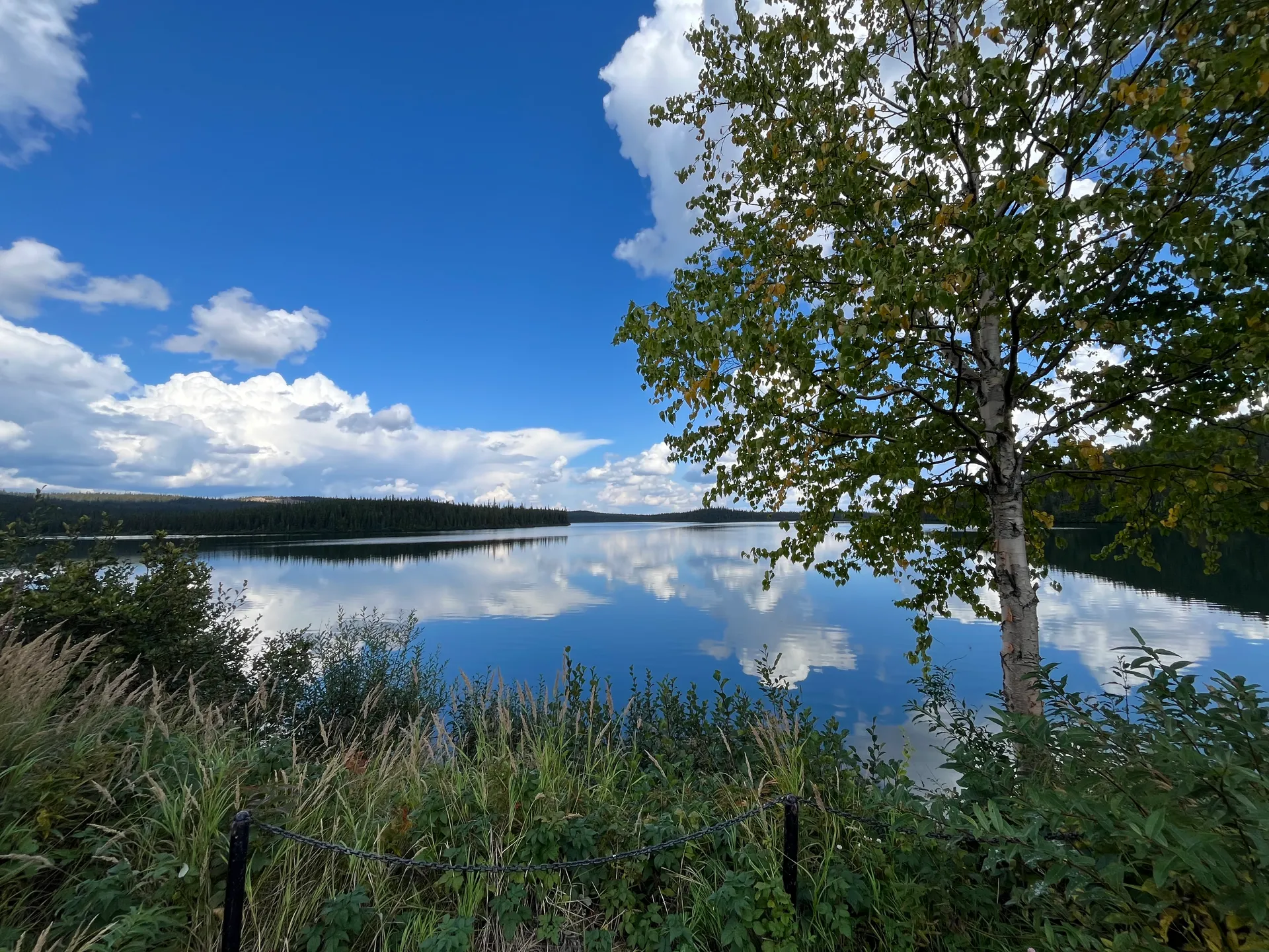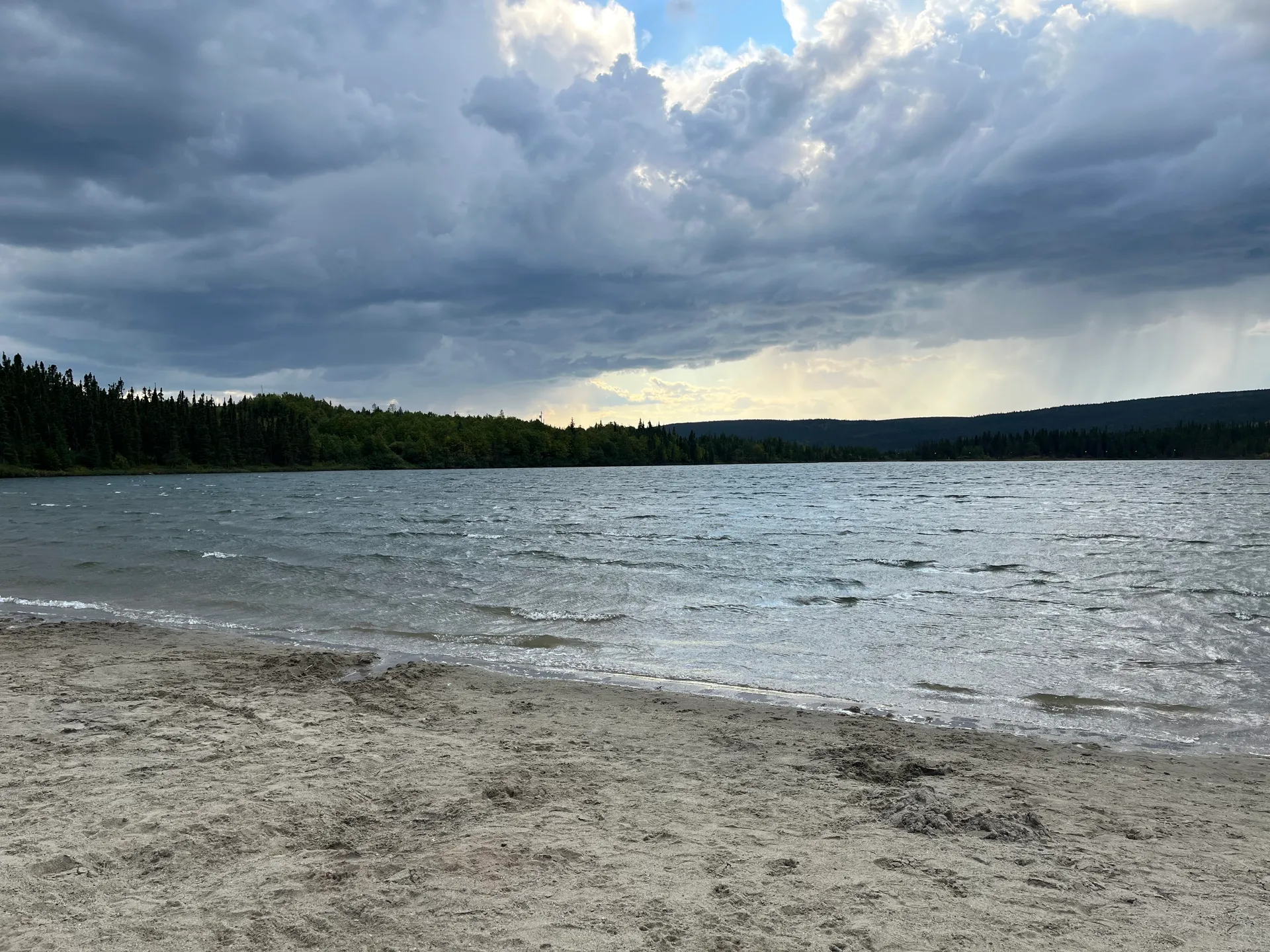 Für die kommende Strecke, mit Schotter und vielen Kurven, bringt uns der Tempomat ohnehin nichts, und Schnee scheint auch nicht in Sicht zu sein. Wir übernachten am Tanya Lake, und ich schaffe es, meine Spazierrunde um den See zu beenden, bevor das Gewitter über das Wasser zieht. Am nächsten Morgen möchte ich ein paar Runden um den See laufen und zwischendurch am Strand jeweils eine Runde Stabi-Übungen einschieben. Die Blackflies finden mich jedoch unfassbar schnell, sodass ich die Stabi-Übungen schnell wieder aufgebe.