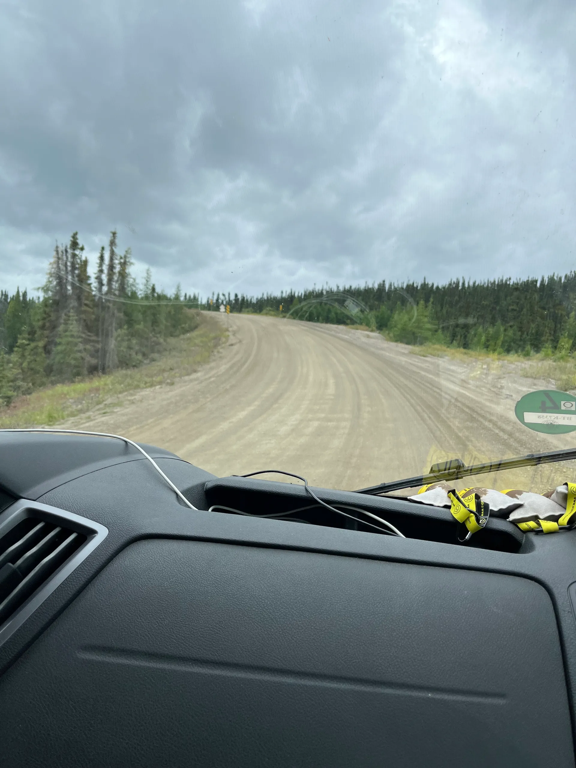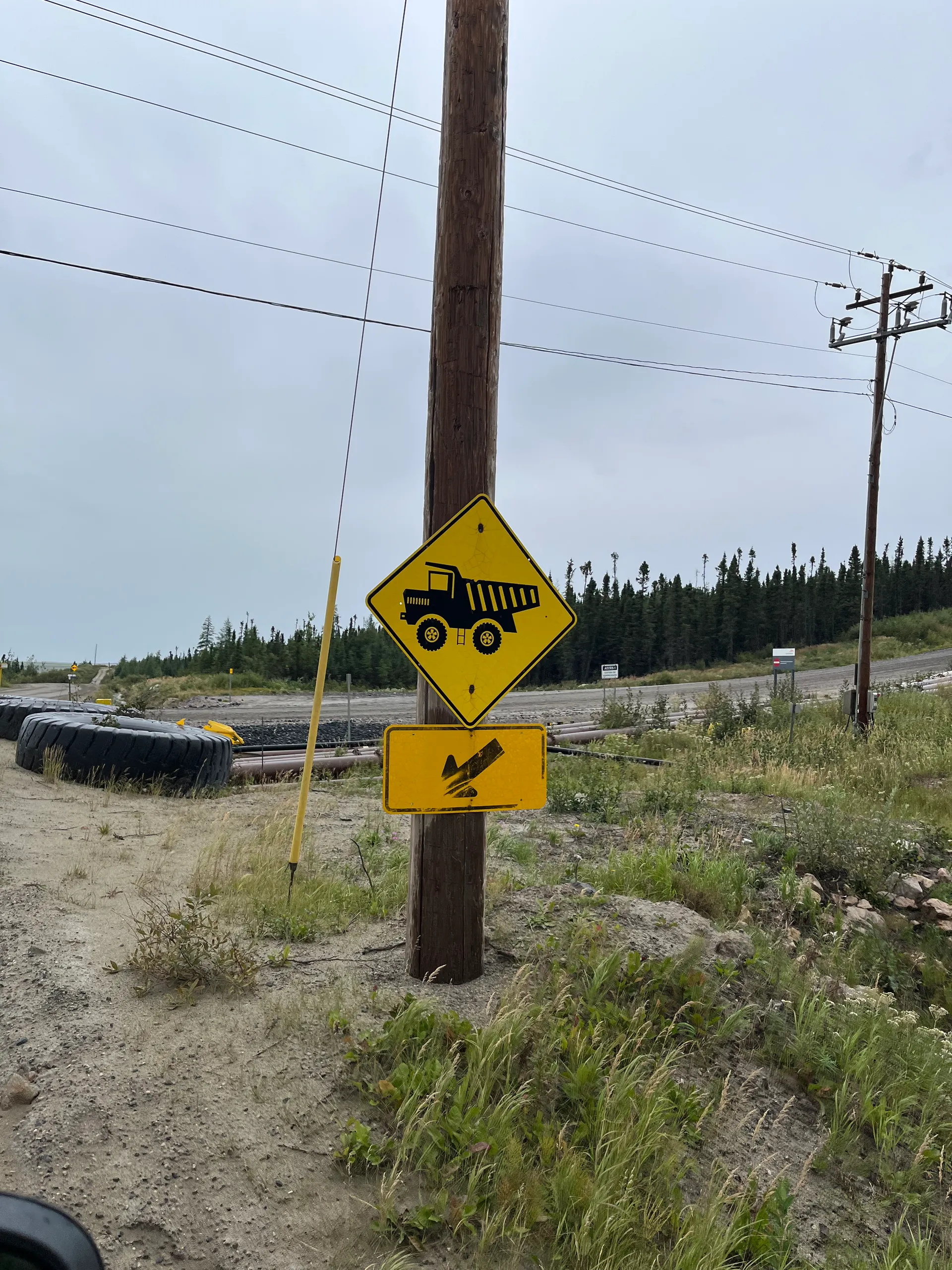 Verlässt man Fermont nach Westen, fährt man direkt in die Ausläufer des Tagebaus Mont-Wright. Man kann sowohl das große Loch im Boden erahnen als auch den Aushub sehen, der sich als künstliche Berge auftürmt. Schilder am Straßenrand warnen vor den riesigen Kippern, und am Straßenrand türmen sich die ausgemusterten Reifen mit mehr als 2 m Durchmesser. Hier beginnt auch der erste unbefestigte Straßenabschnitt mit 67 km Länge. Es ist aber keine tiefe Schotterpiste, sondern eher ein sehr gut verdichteter, zweispuriger Feldweg. Trotzdem ist Vorsicht geboten. Wenn man von einem LKW überholt wird, sollte man am besten rechts ranfahren und abwarten, bis er vorbei ist. Den Fahrern sind die Geschwindigkeitsbegrenzungen nämlich genauso egal wie die Gefahr, dass sie einem ein Stein die Windschutzscheibe jagen. Bleibt die Frage, warum nach über 1.000 km durch Labrador ausgerechnet hier die Straße nicht ausgebaut wurde. Dabei gab es 2018 ein großes Projekt, um die 389 auszubauen.