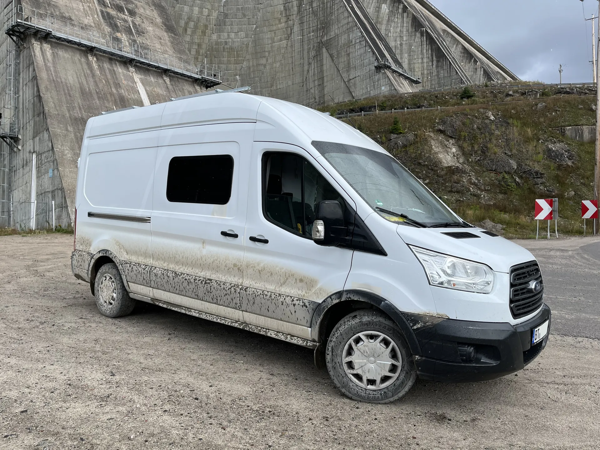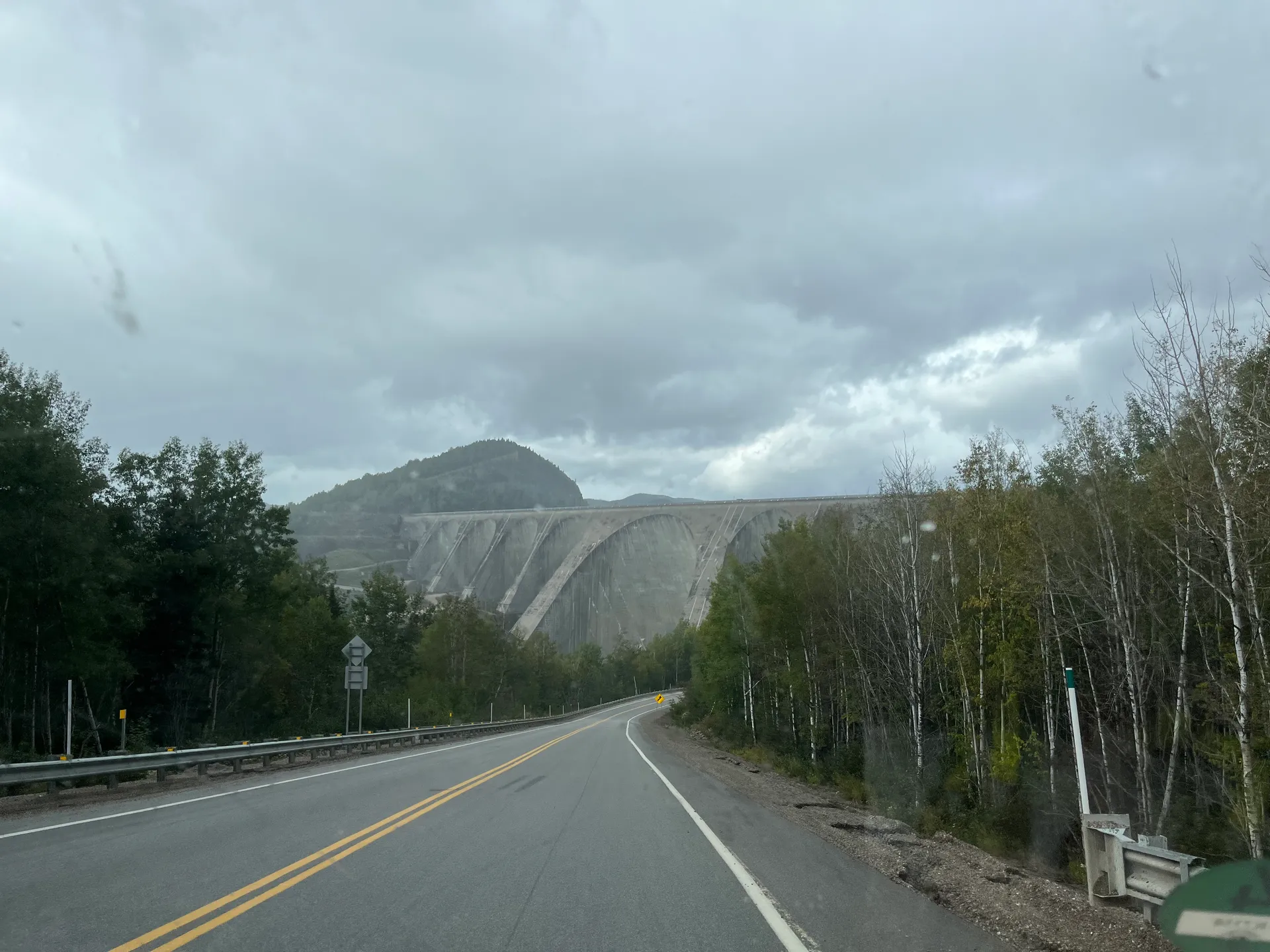 Der zweite Abschnitt mit unbefestigteren Straßen ist deutlich weniger spannend als der hinter Fermont. Dafür ziemlich lang. Von Relais-Gabriel, einer Tankstelle mit Café, sind es 104 Kilometer bis nach Manic-5. Es ist gut zu fahren; nur ein Problem gibt es: Es hat am Tag vorher geregnet und jetzt sieht der Camper ziemlich verdreckt aus. Kurz vor Manic-5 ist die Straße dann auch wieder befestigt. Über Serpentinen fährt man hinunter zum Fuß des 214 Meter hohen Staudamms und fühlt sich dann sehr klein.