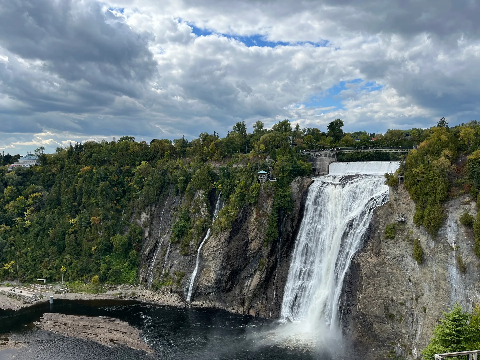 Der Park kostet Eintritt, aber die 6,30 CAD pro Person (umgerechnet ca. 4 €) sind es wert. Der Montmorency mündet hier in den Sankt‑Lorenz‑Strom; auf den letzten Metern stürzt er 83 Meter in die Tiefe. Das sind 30 Meter mehr als bei den Niagarafällen, die Wassermenge ist allerdings deutlich geringer.