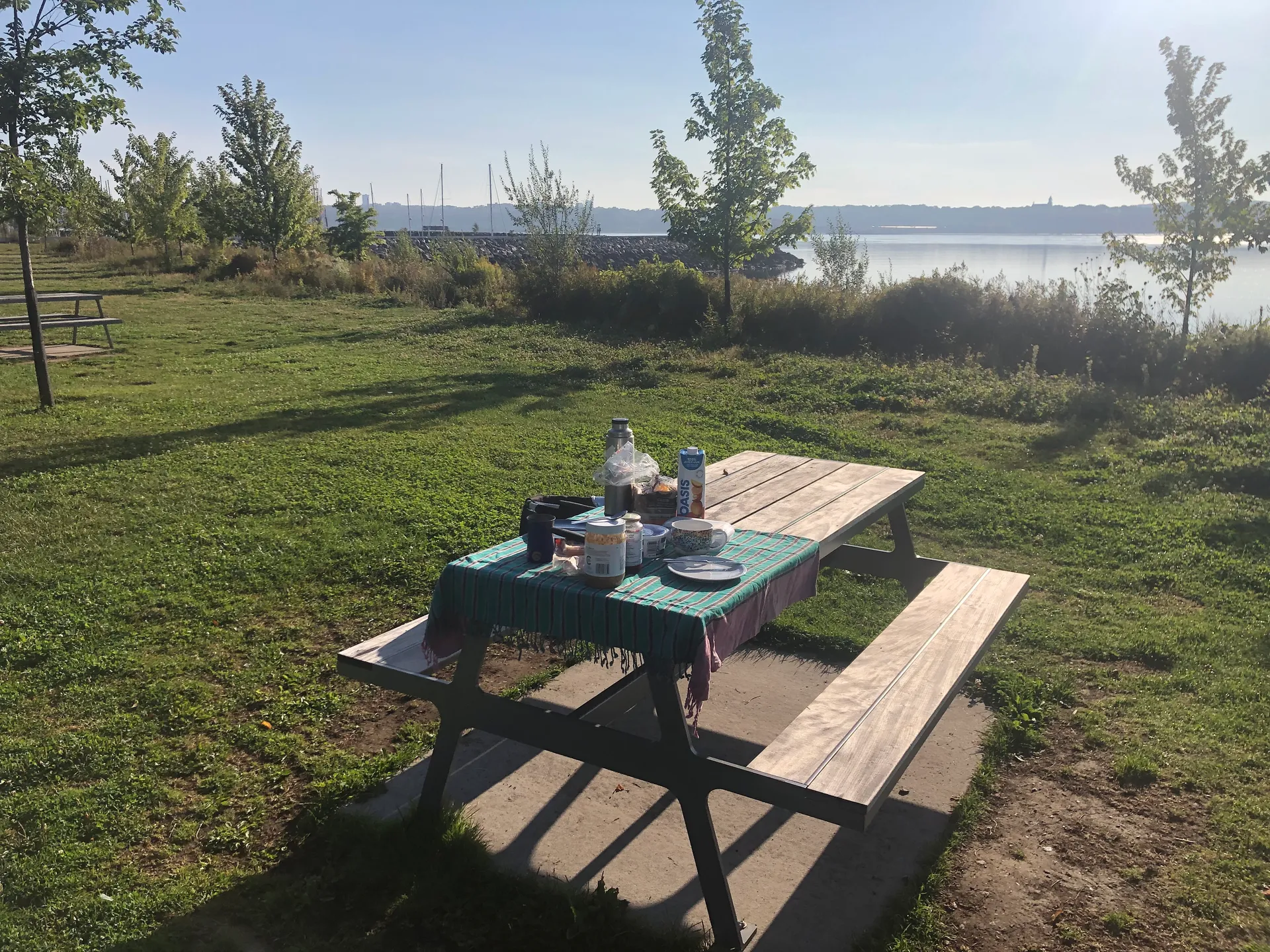 Entlang der Nordseite des Flusses gibt es mehrere Parks mit Picknickplätzen. Hier kann man die Sonne genießen, lesen und den Schiffen zuschauen. Am nächsten Morgen parken wir um und frühstücken an einem dieser Parks, bevor wir weiter Richtung Montréal fahren.
